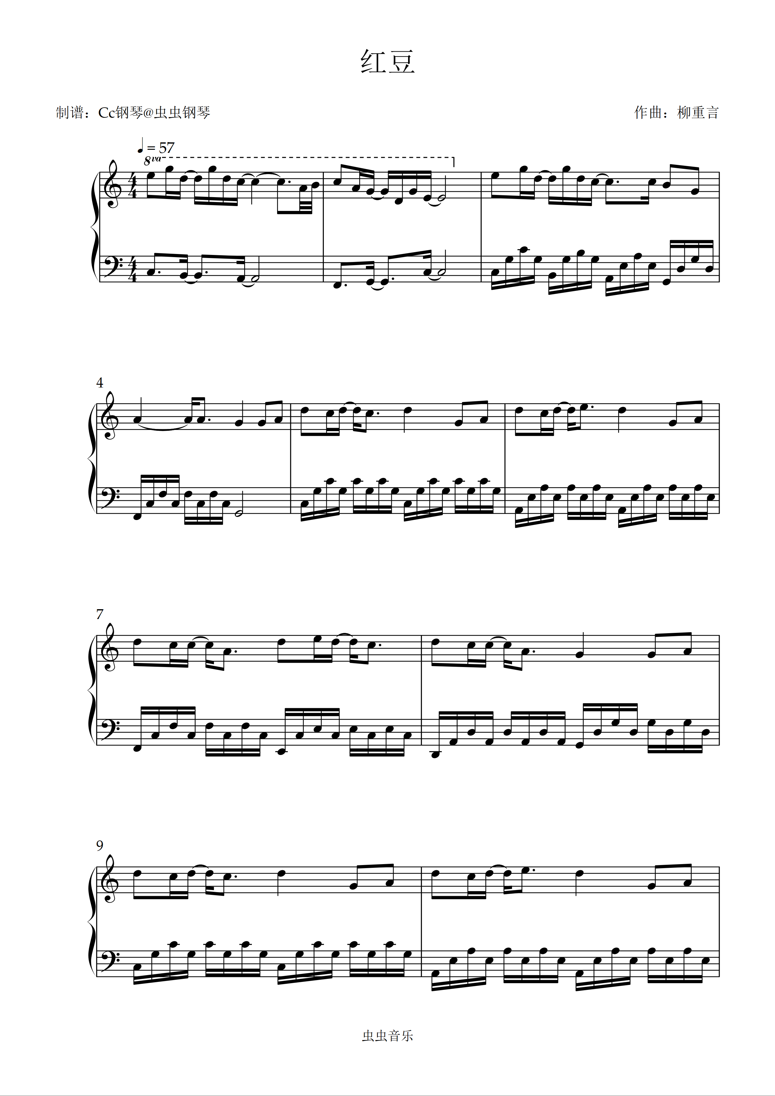 • 红豆钢琴简谱 C调 数字双手 林夕