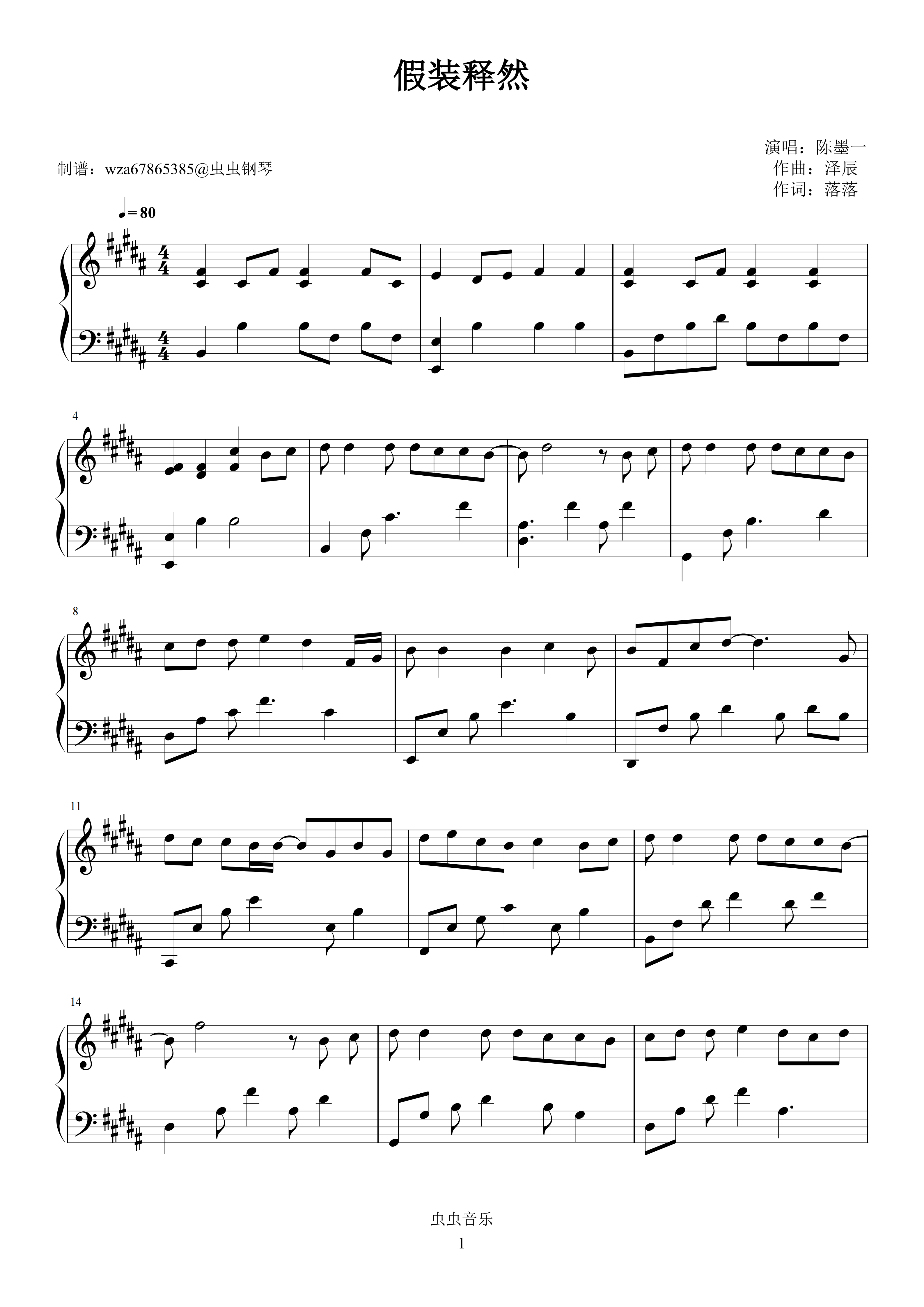 • 假装 (陈雪凝)钢琴简谱 多调 数字双手 陈雪凝