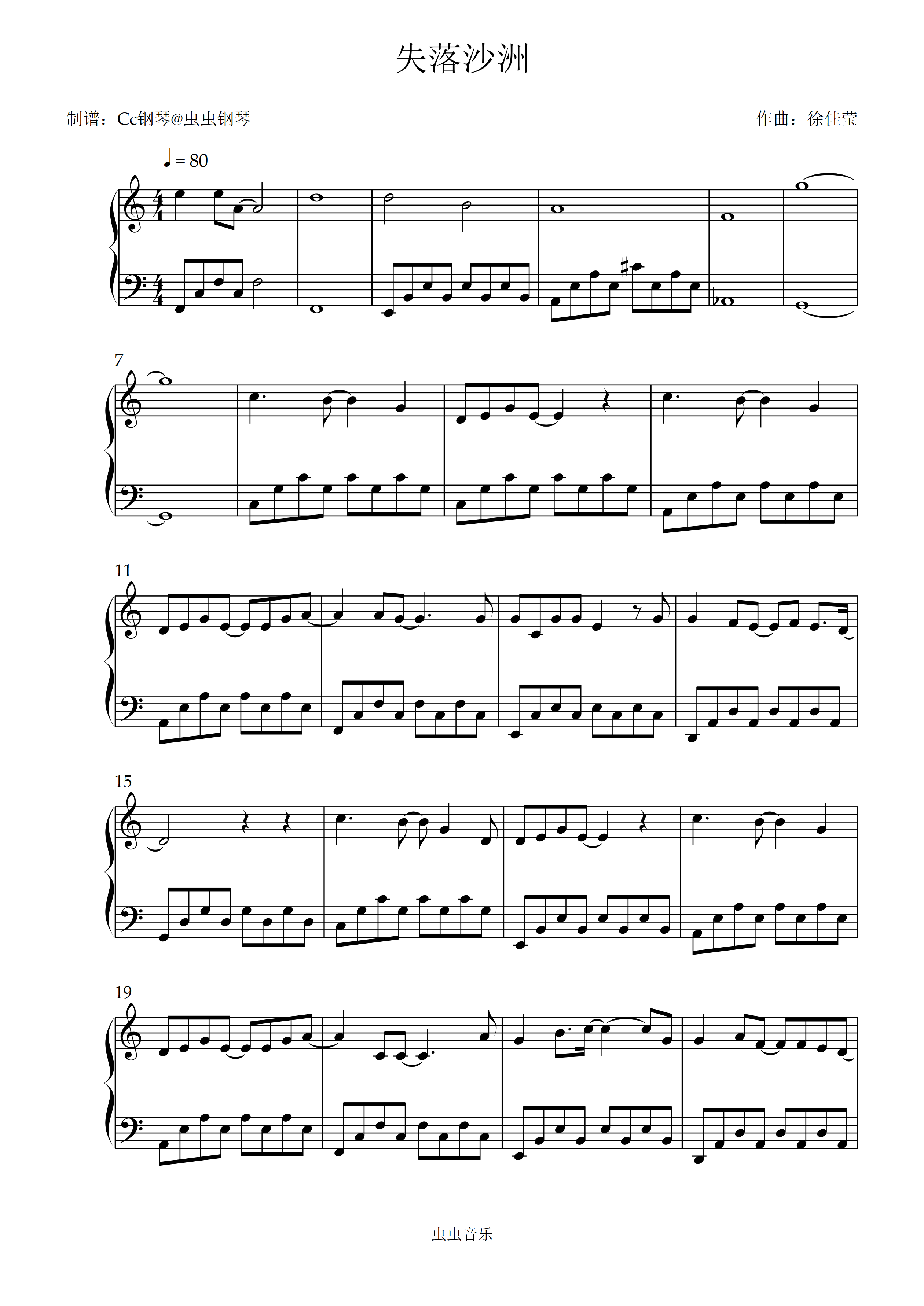 • 失落沙洲钢琴简谱 G调 数字双手 徐佳莹