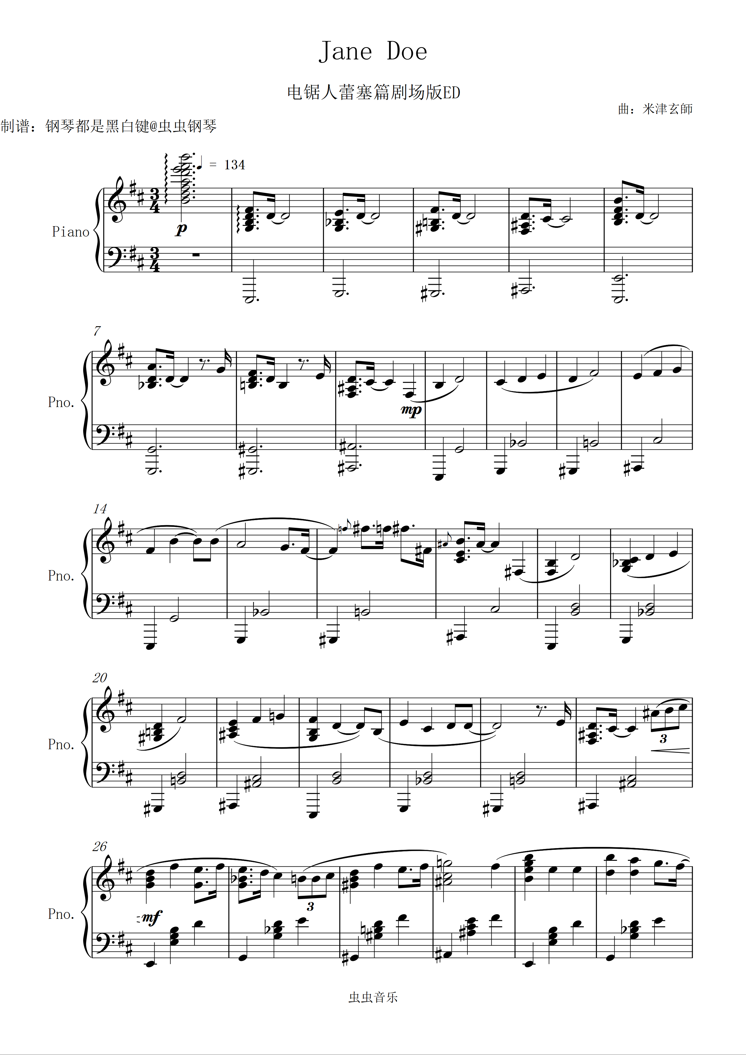 钢琴谱:《电锯人 蕾塞篇》ED「JANE DOE」/ 米津玄師, 宇多田光