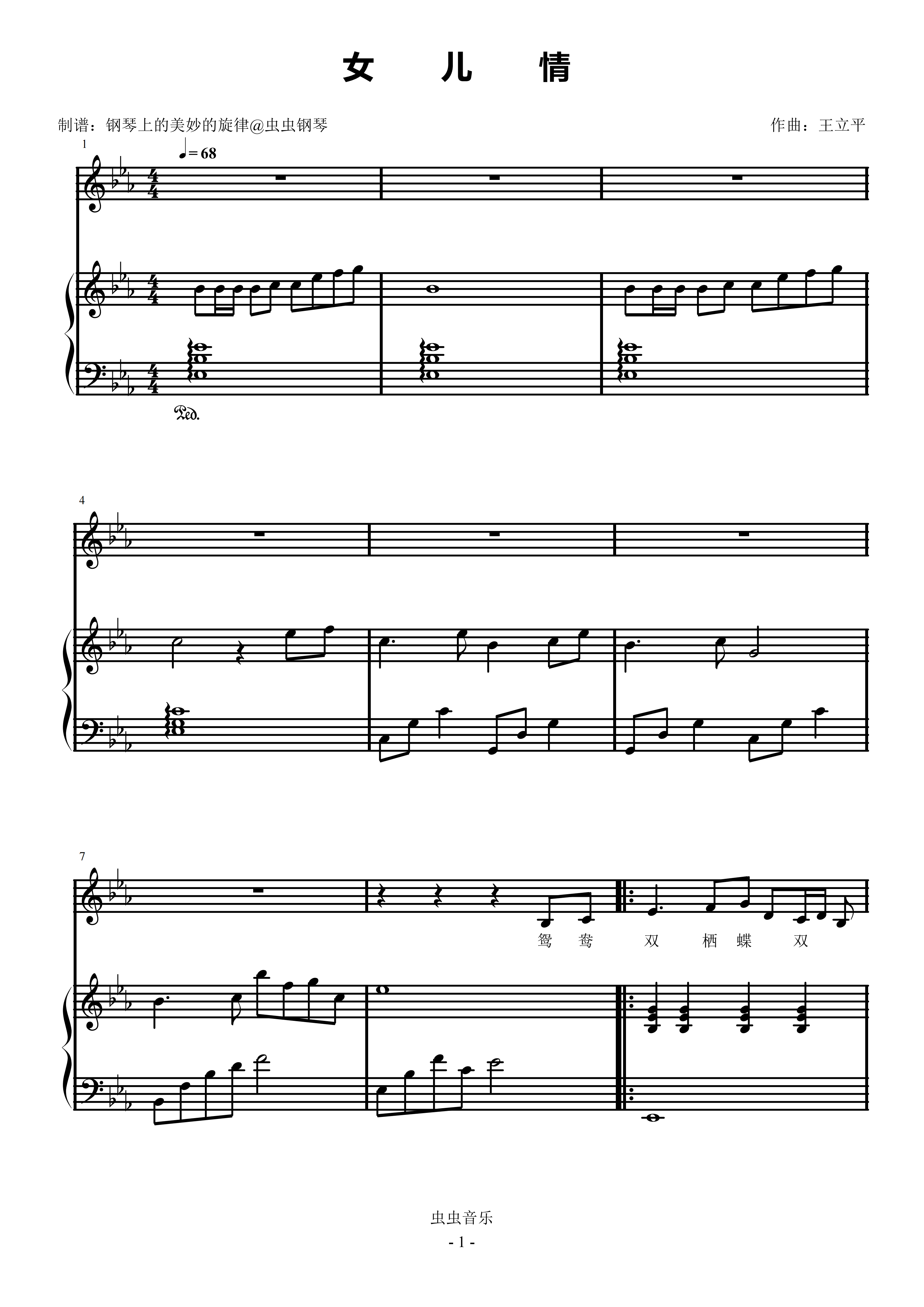 钢琴谱:女儿情 简易钢琴弹唱伴奏 带歌词