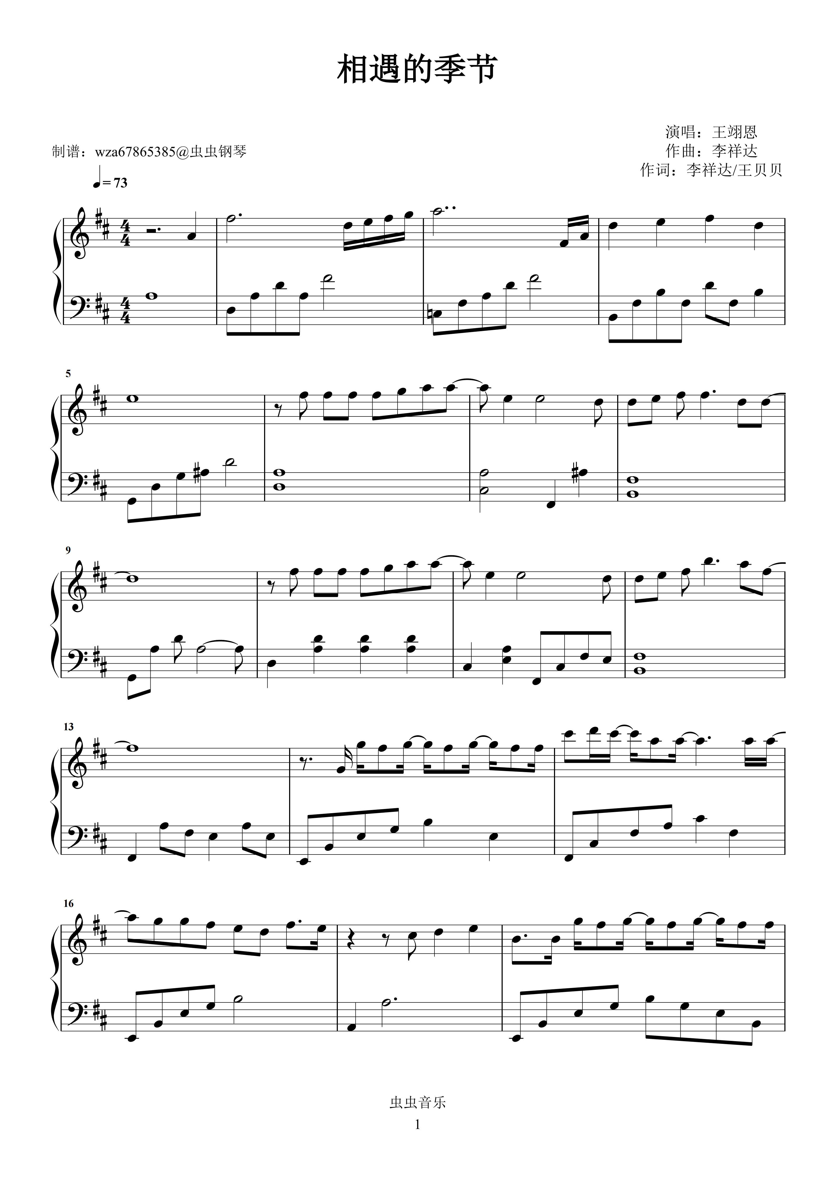 • 有你的季节钢琴简谱 G调 数字双手 Ewen贰文、刘耀文