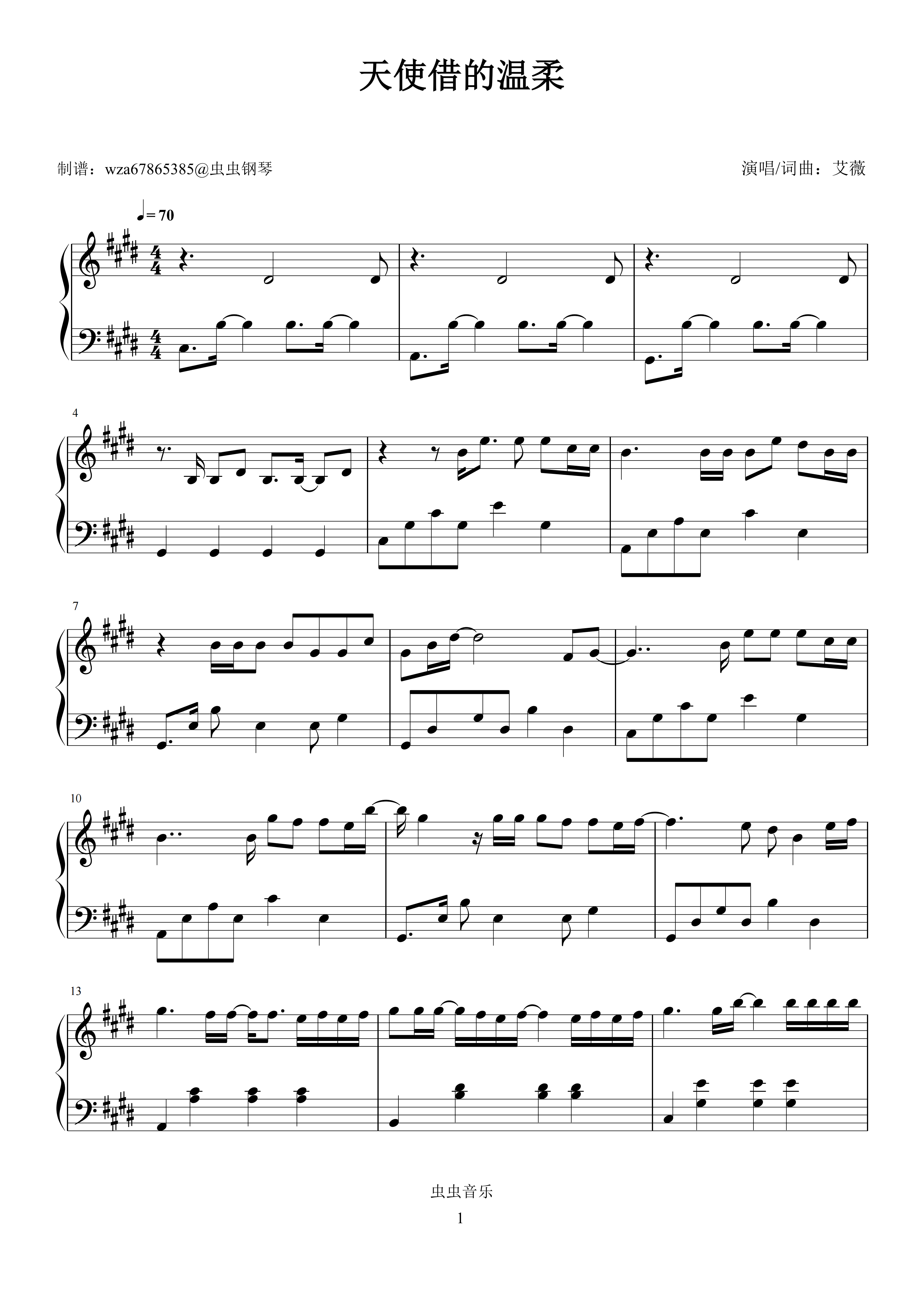天使借的温柔钢琴简谱 数字双手 艾薇