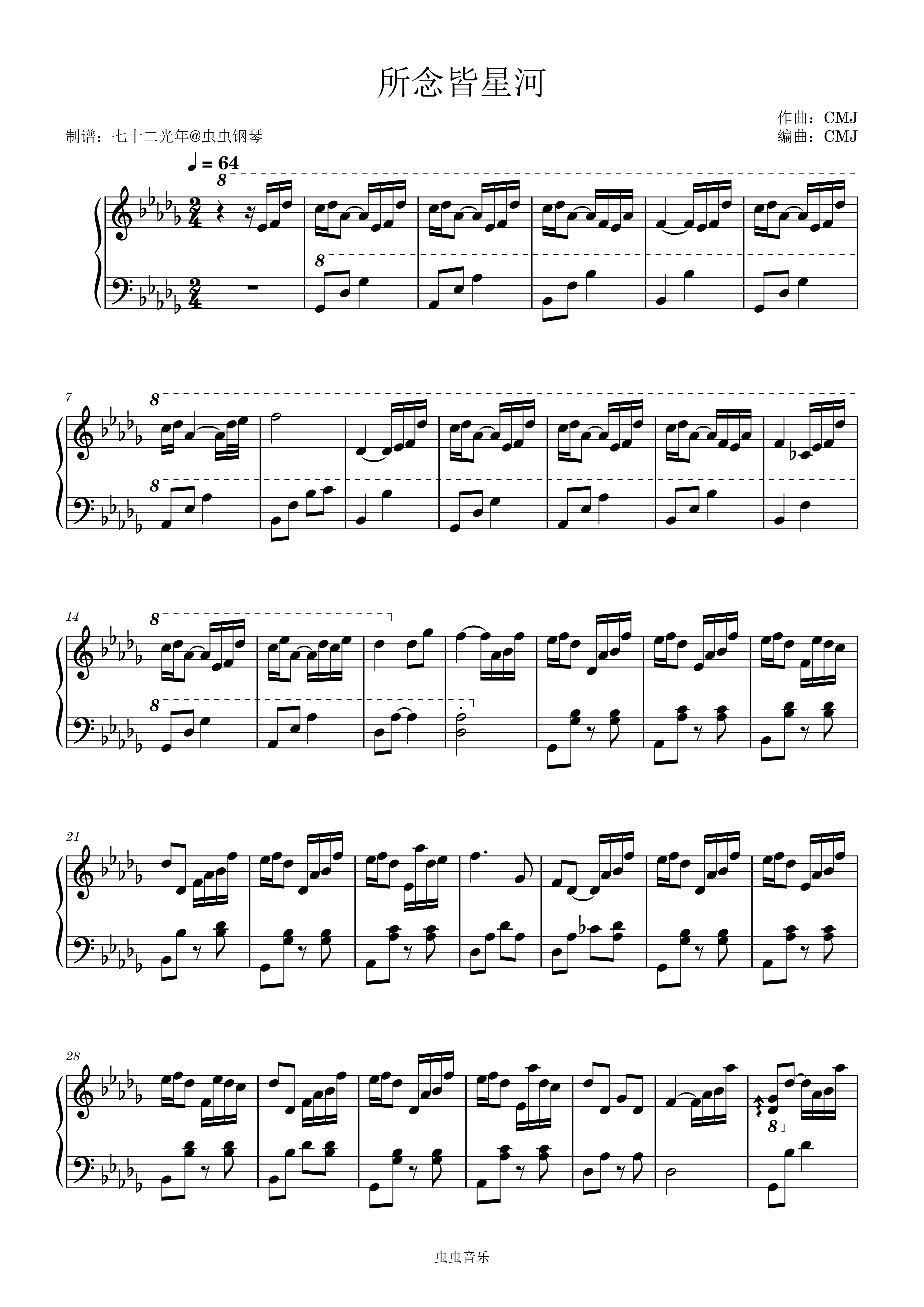 • 所念皆星河钢琴简谱 bb调 数字双手