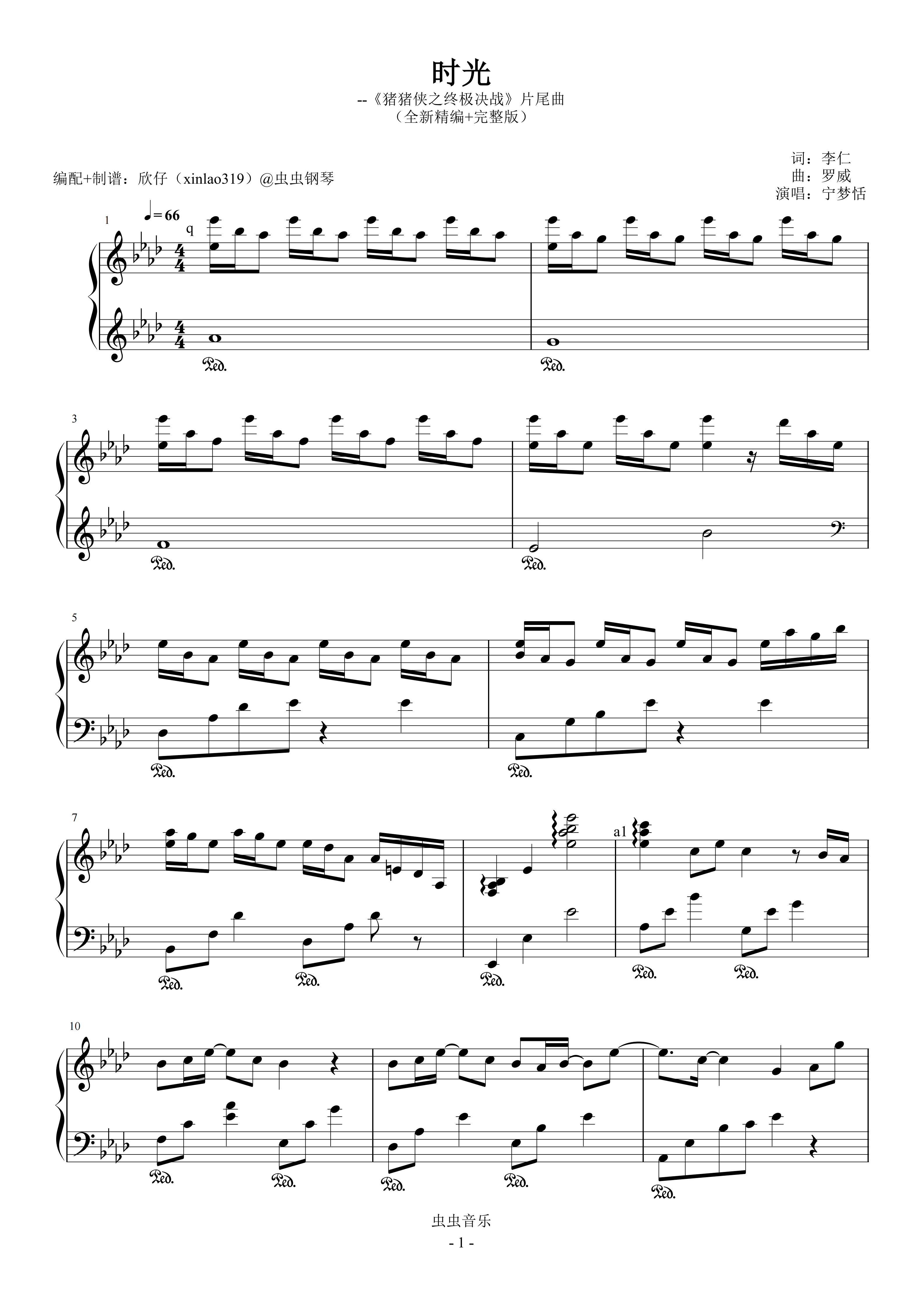 钢琴谱:时光(原调降A《猪猪侠之终极决战》片尾曲、完整版)