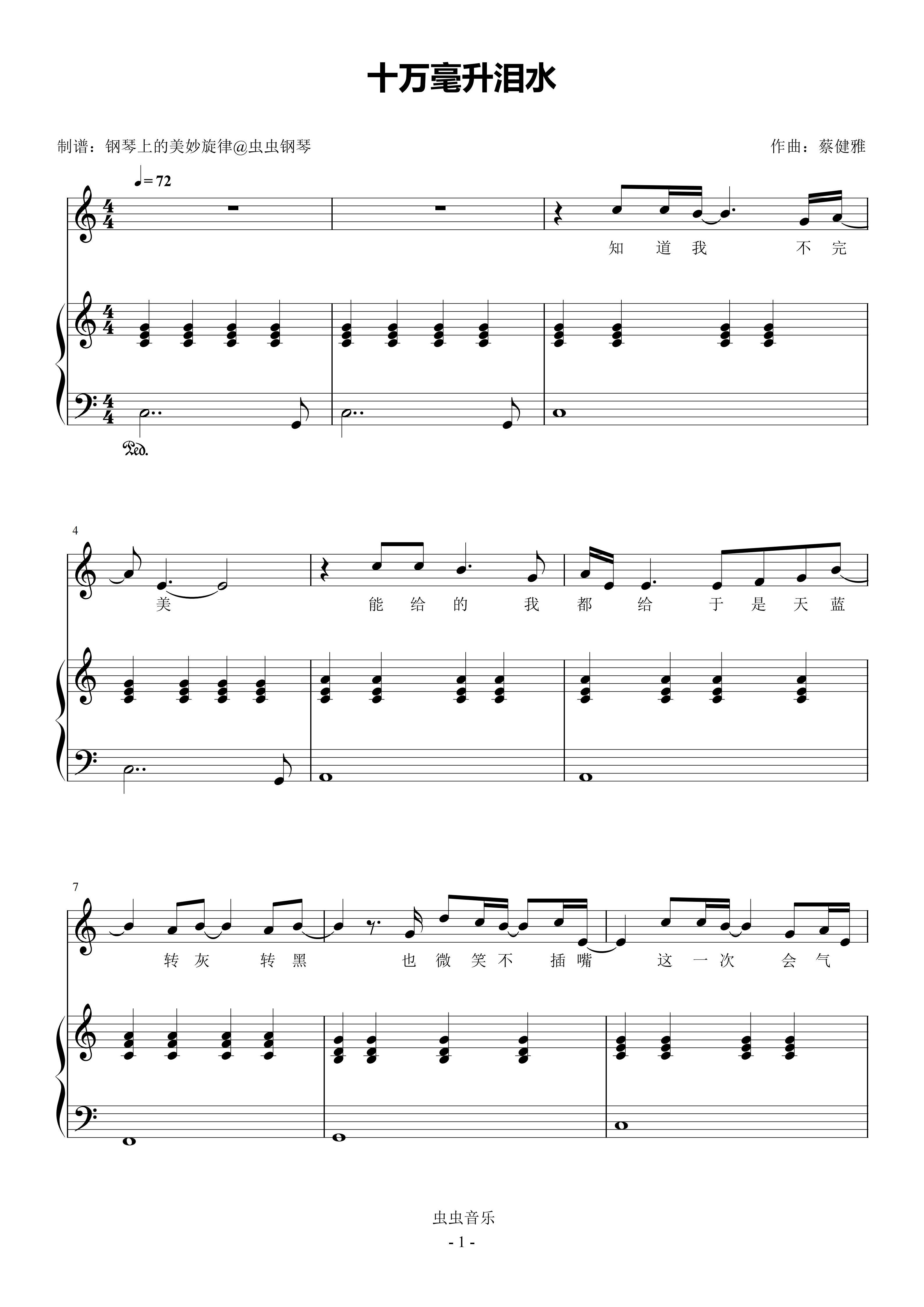 钢琴谱:十万毫升泪水 C调简易钢琴弹唱伴奏 带歌词 蔡健雅