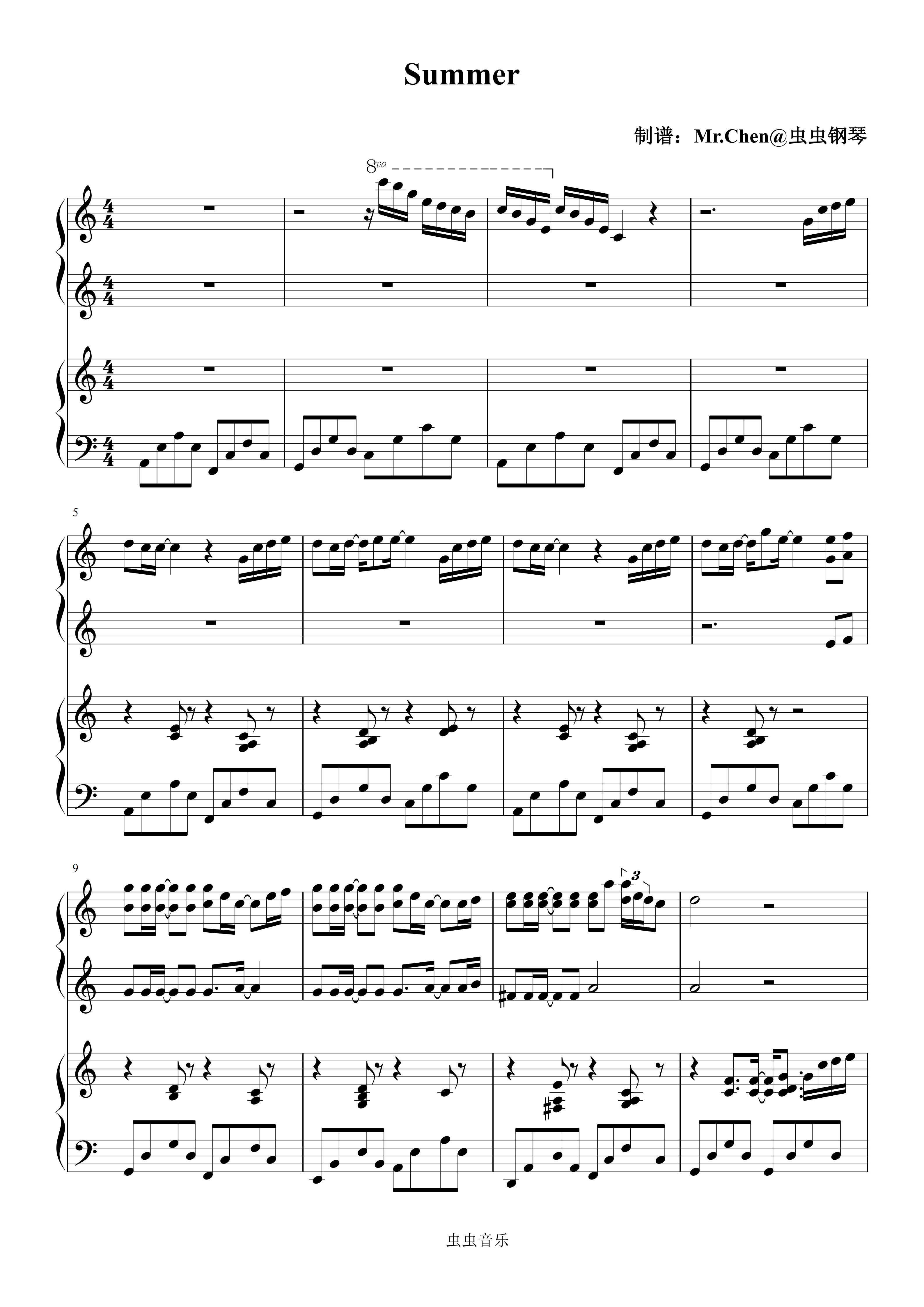 钢琴谱:Summer (四手联弹)C调 -【菊次郎的夏天】 久石让