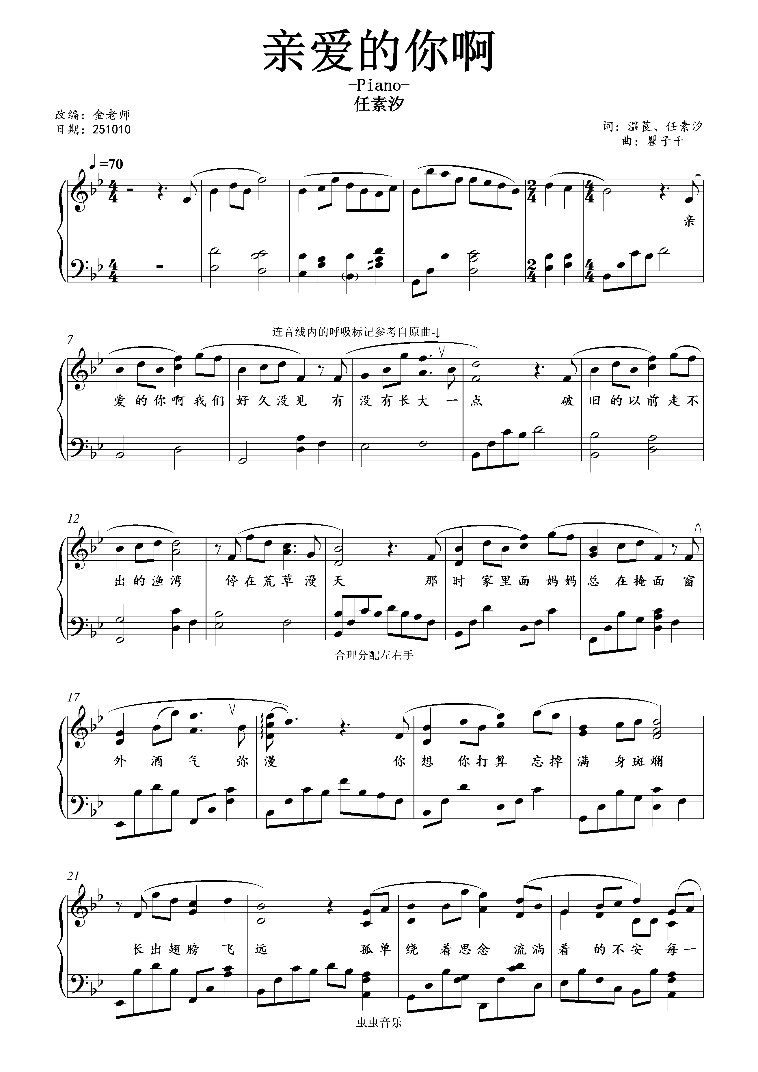 钢琴谱:亲爱的你啊-金老师钢琴独奏谱