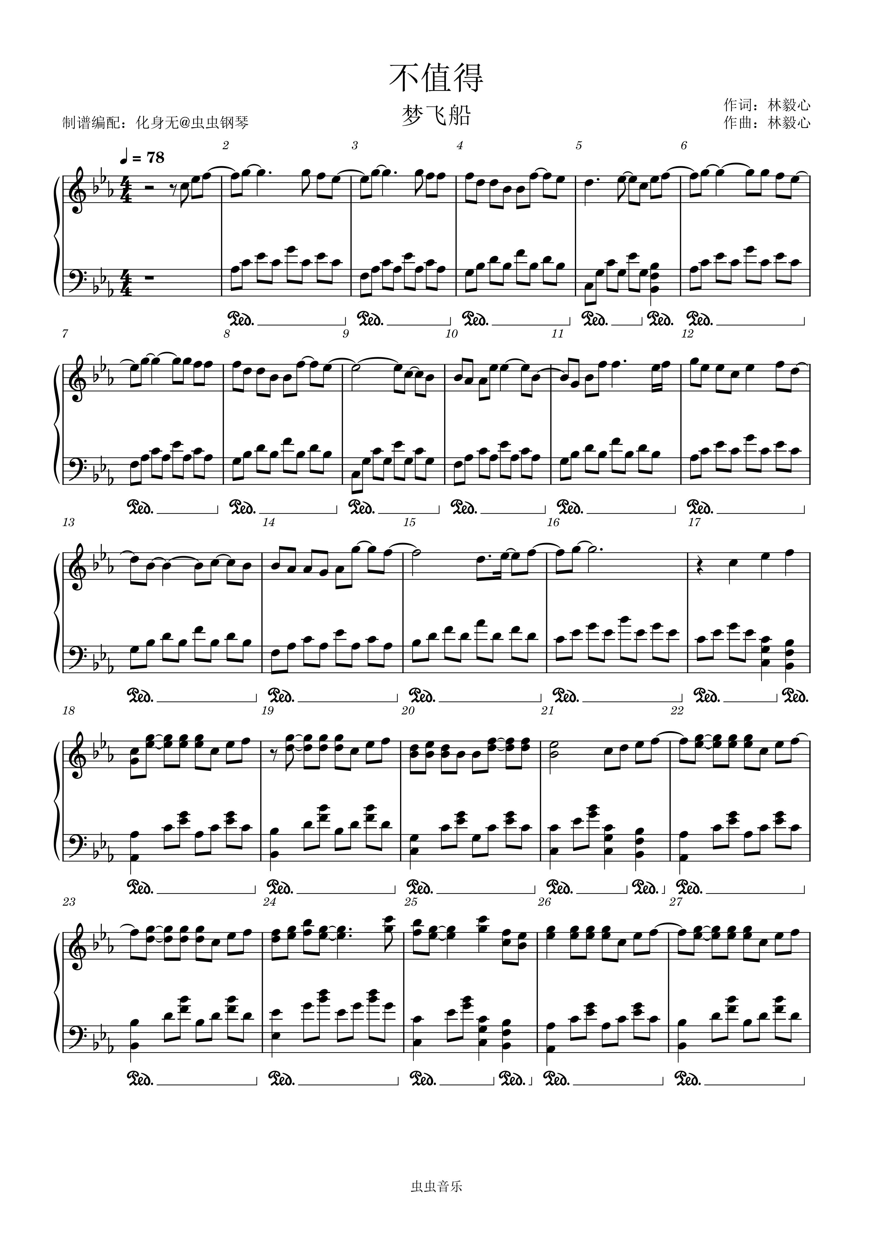 • 不值得钢琴简谱 F调 数字双手 林毅心