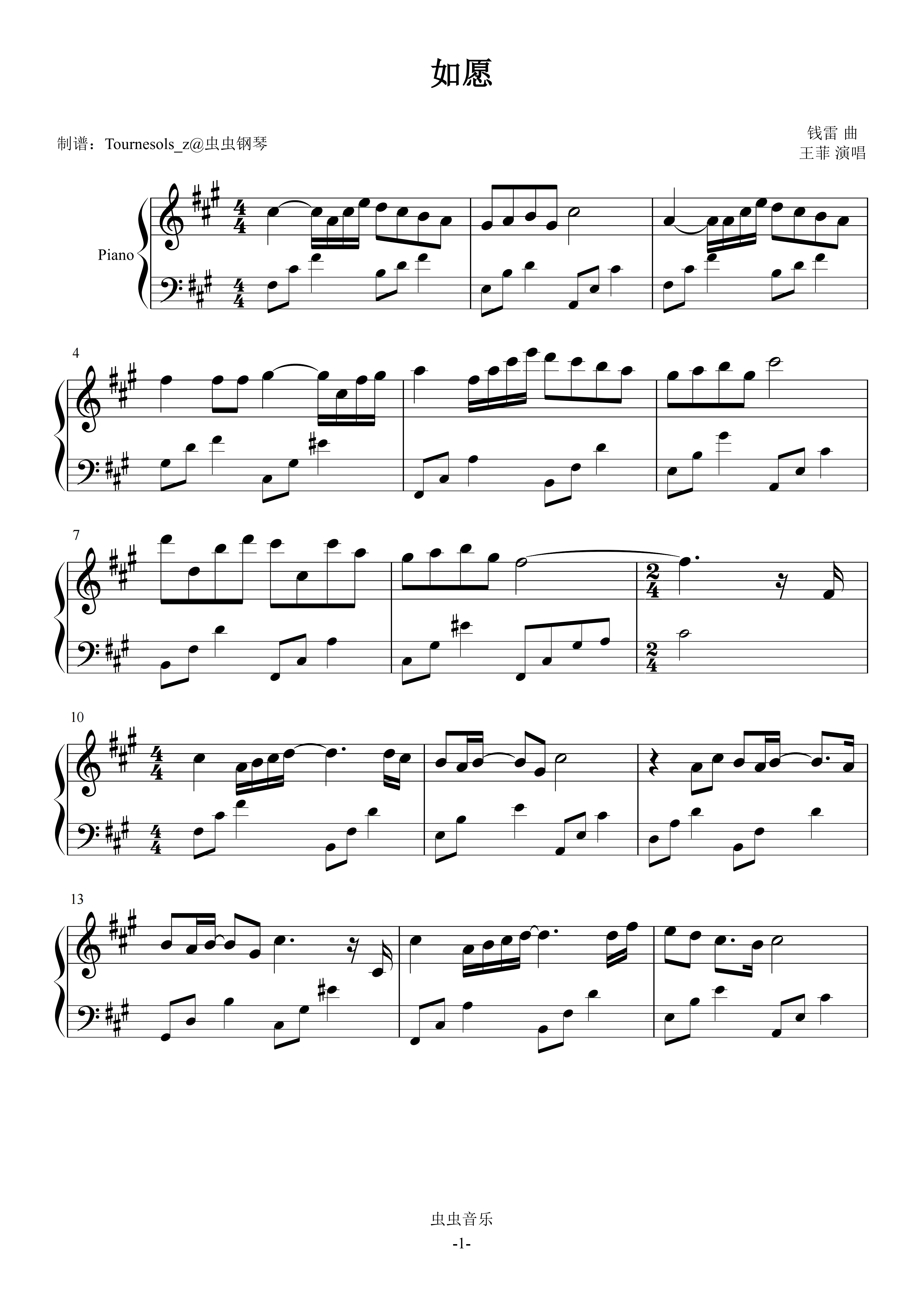 • 如愿钢琴简谱 A调 数字双手 唐恬
