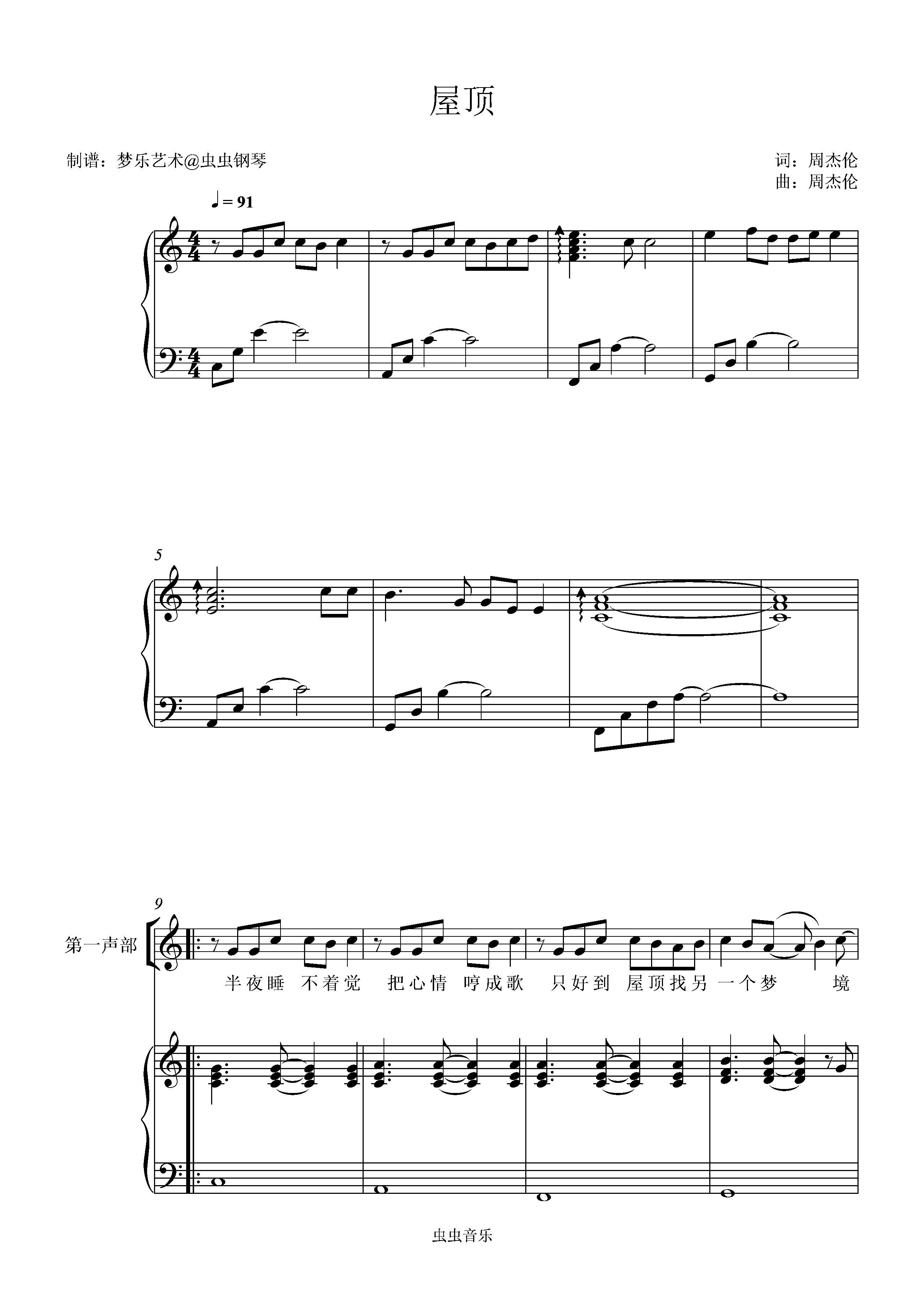 • 屋顶 (周杰伦)钢琴简谱 C调 数字双手 周杰伦