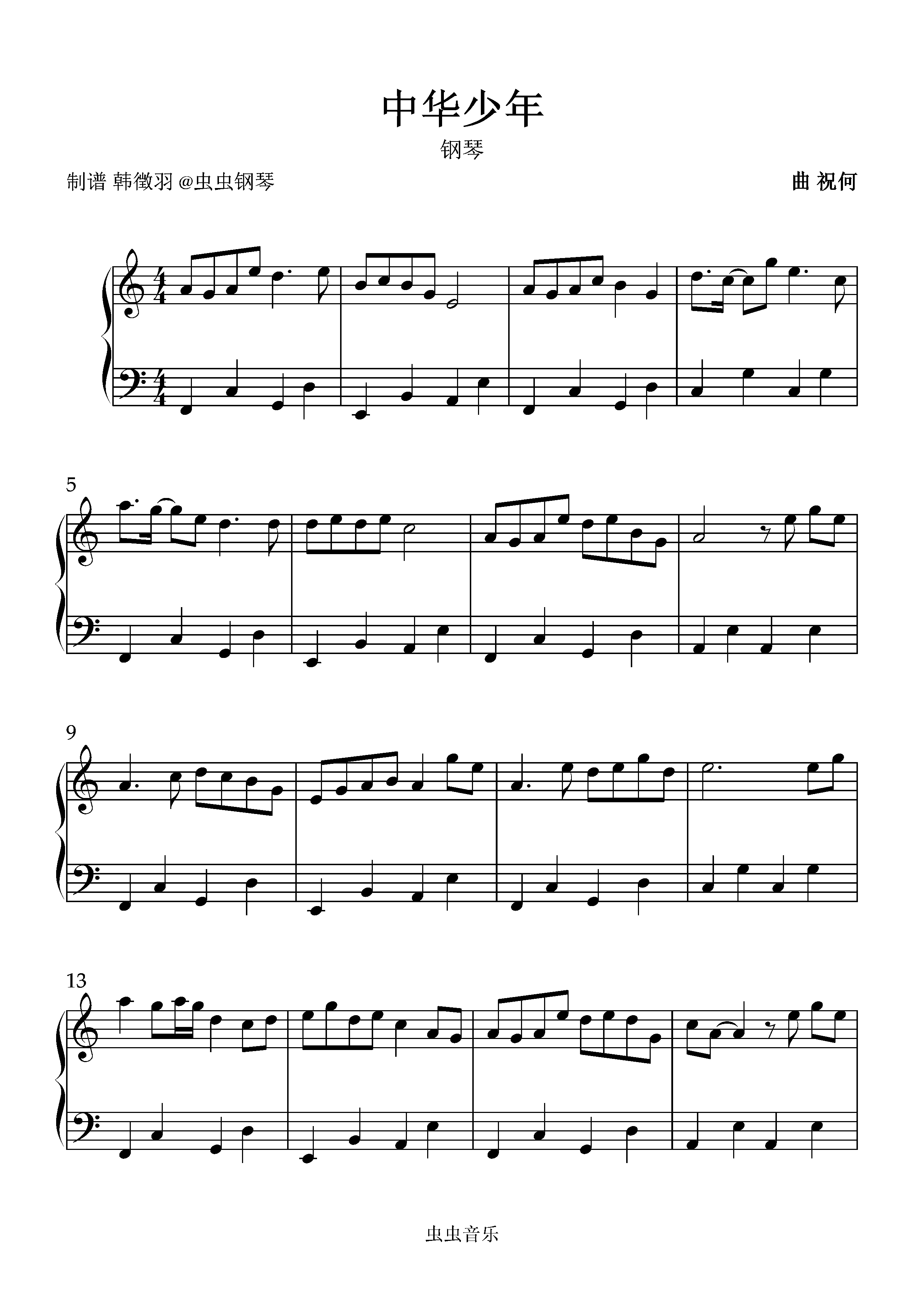 钢琴谱:中华少年C调简单易弹版