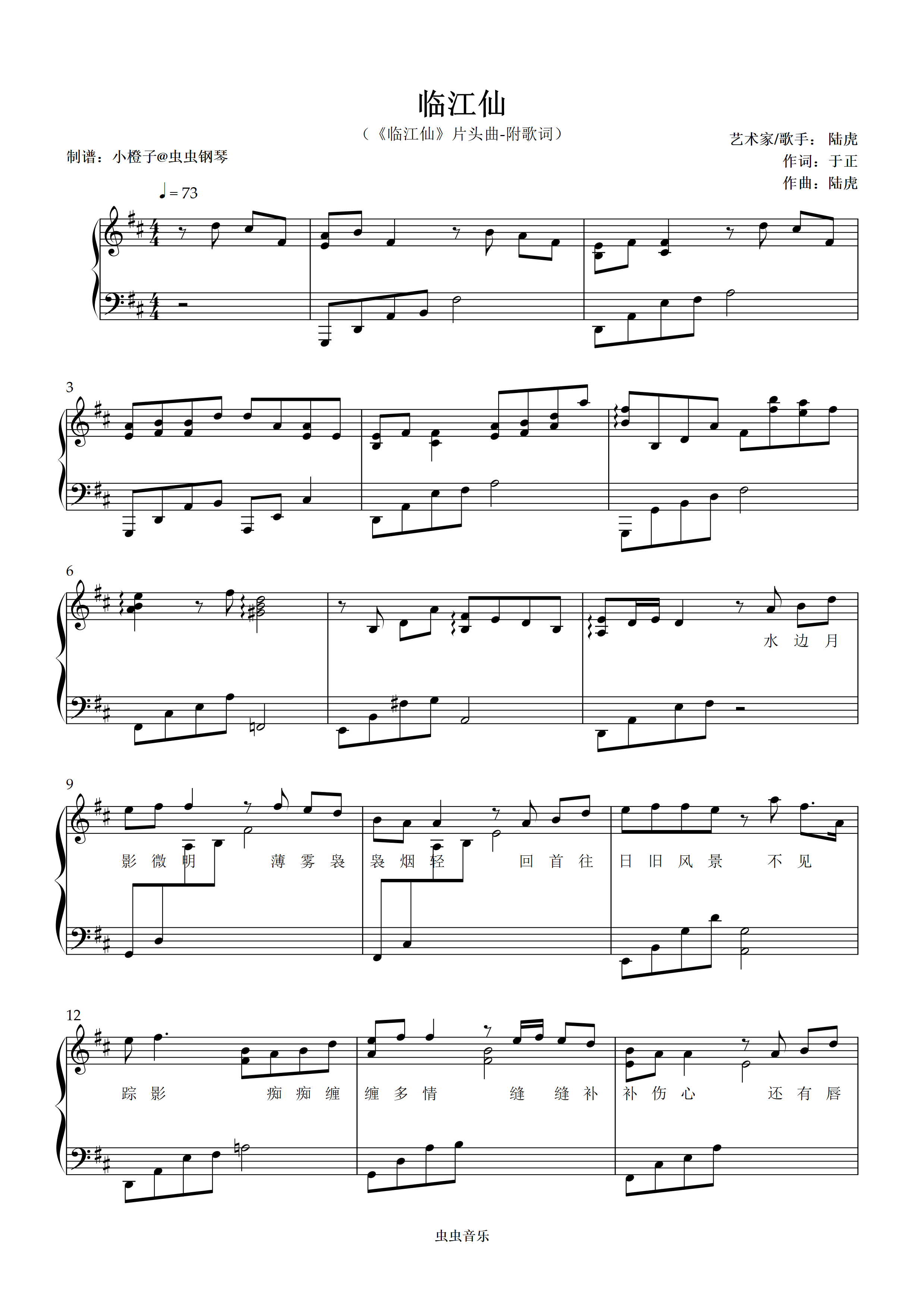 钢琴谱:临江仙-陆虎// 附歌词+D大调+弹唱谱