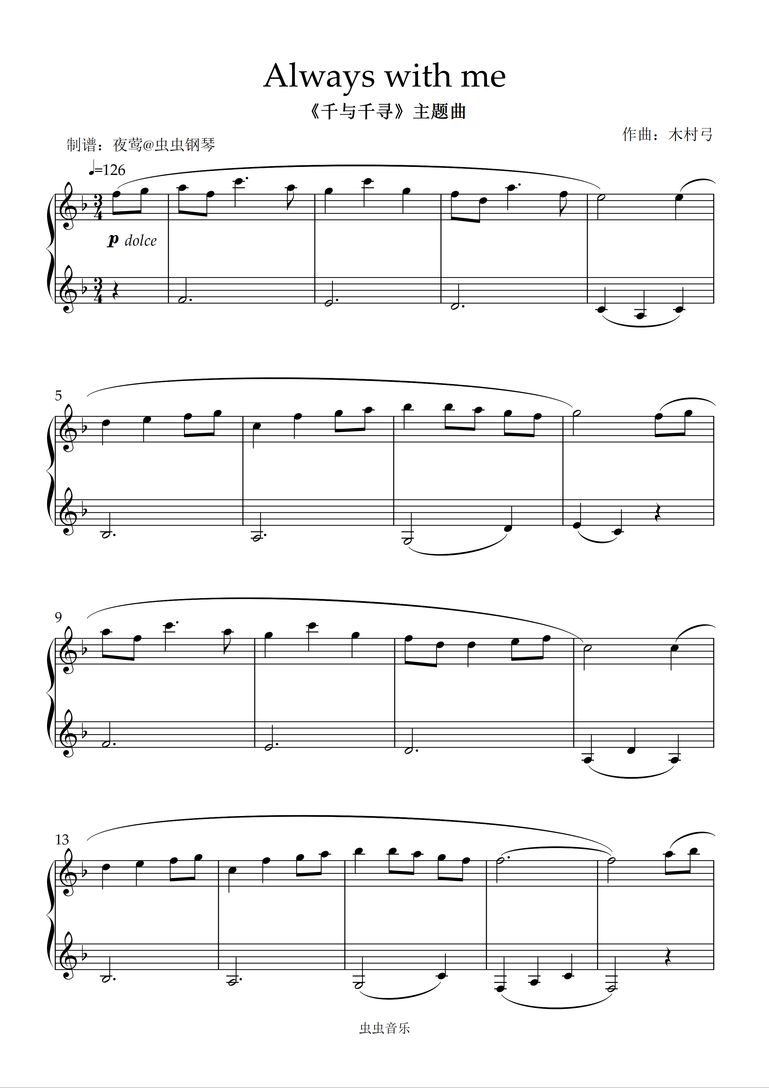 千与千寻主题曲《永远同在-Always with me》原调F调-简易版