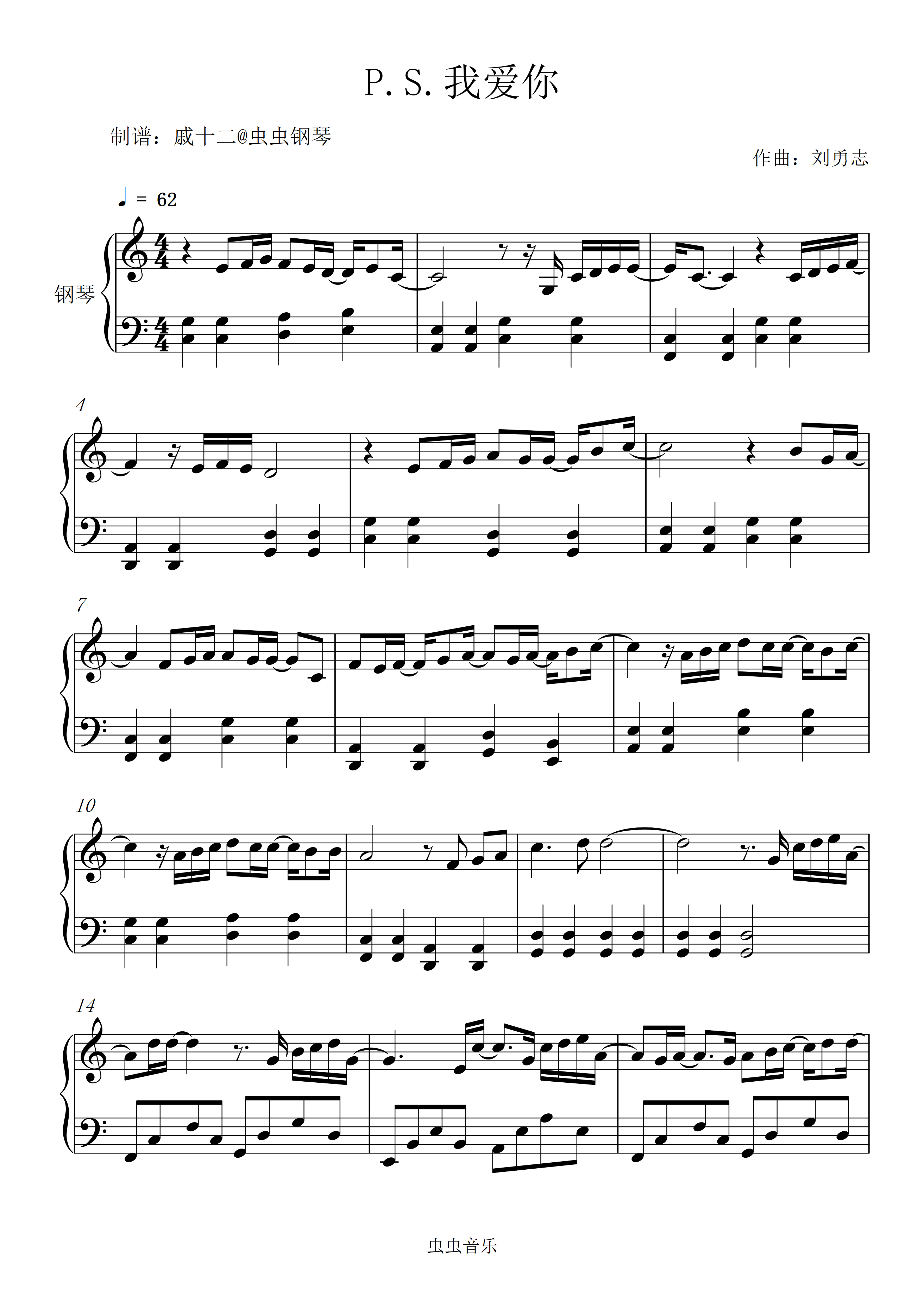 • 我爱你,中国钢琴简谱 C调 数字双手