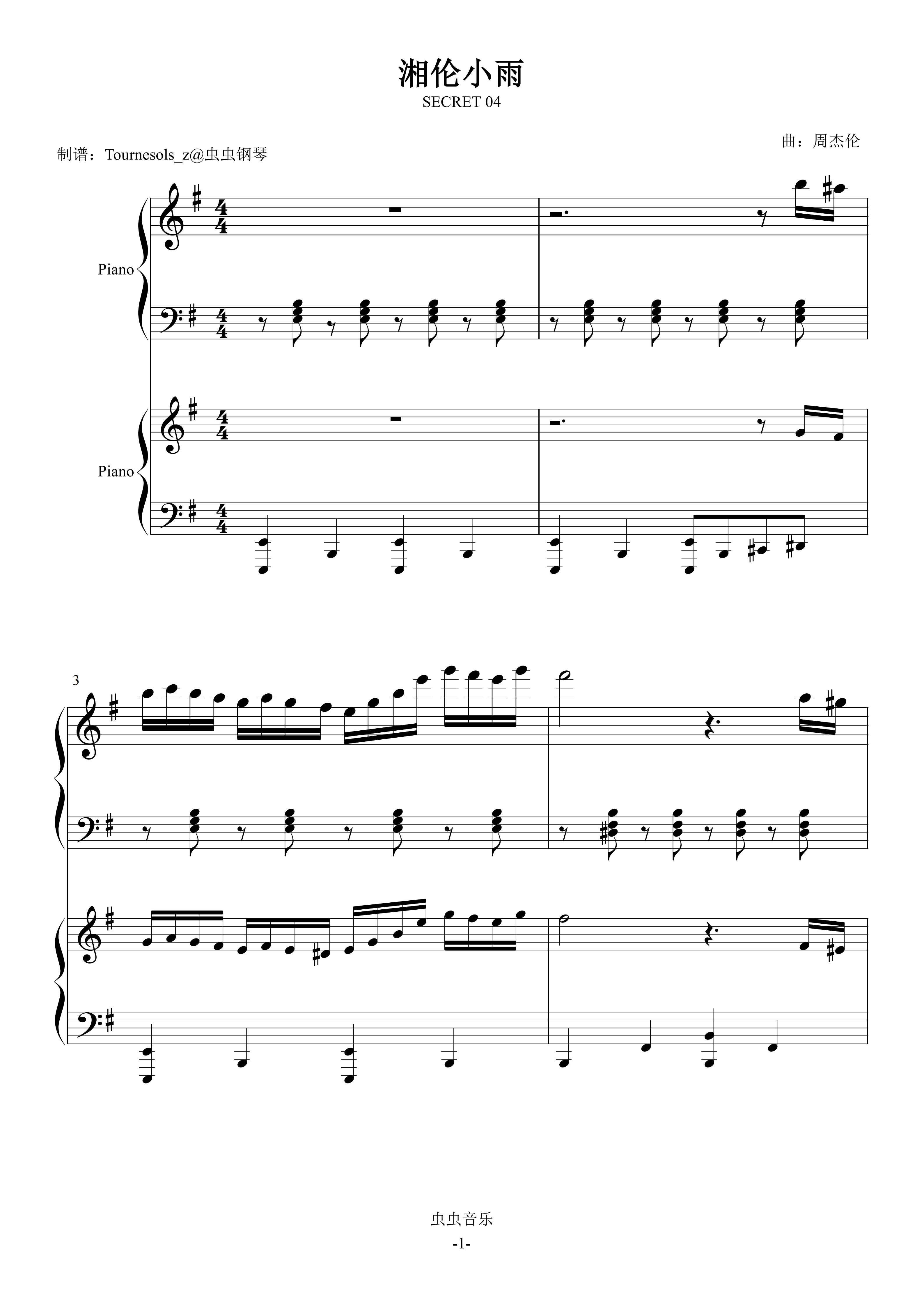 钢琴谱:湘伦小雨(写真原谱,不能说的秘密四手联弹)
