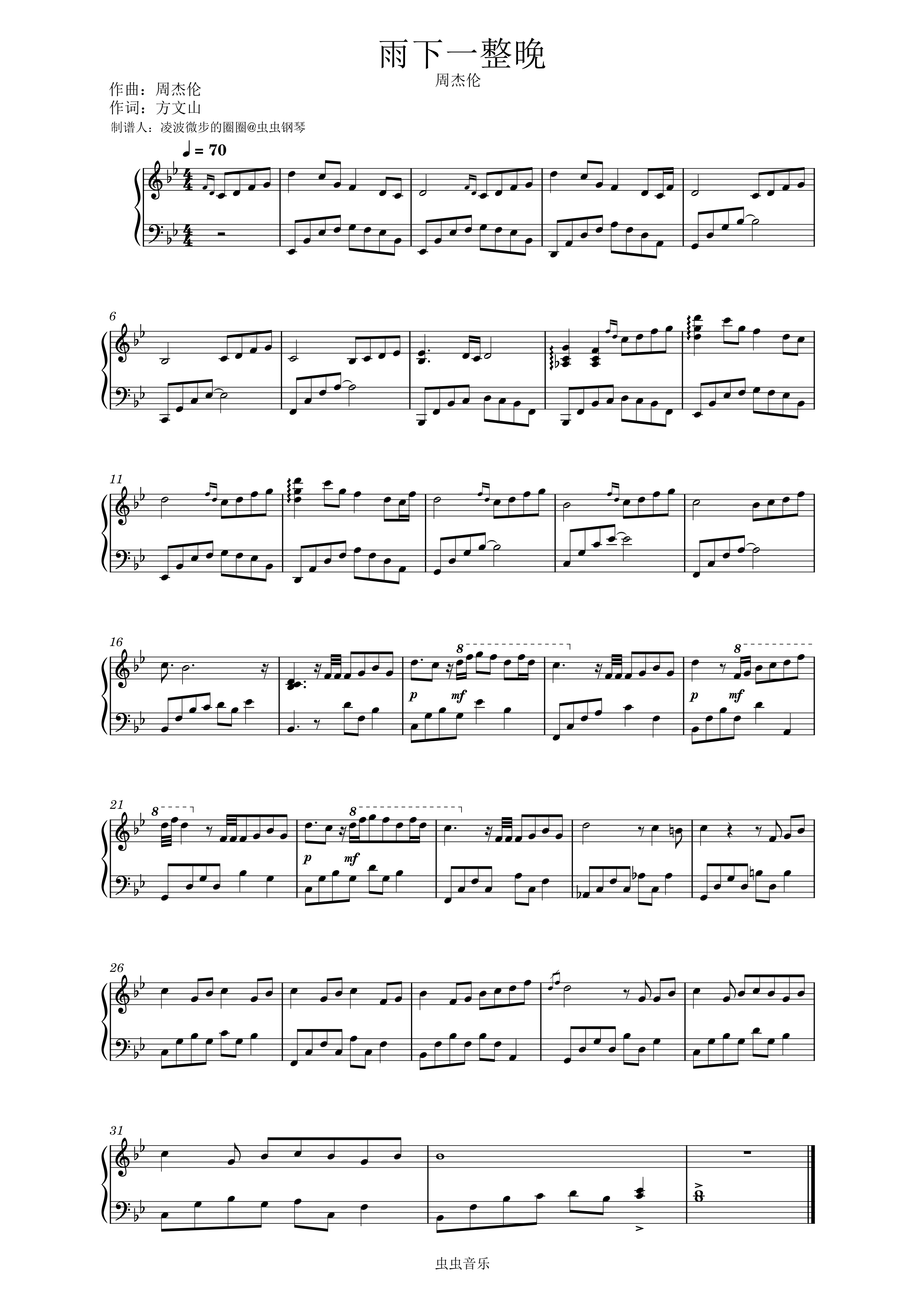 • 雨下一整晚钢琴简谱 Bb调 数字双手 方文山