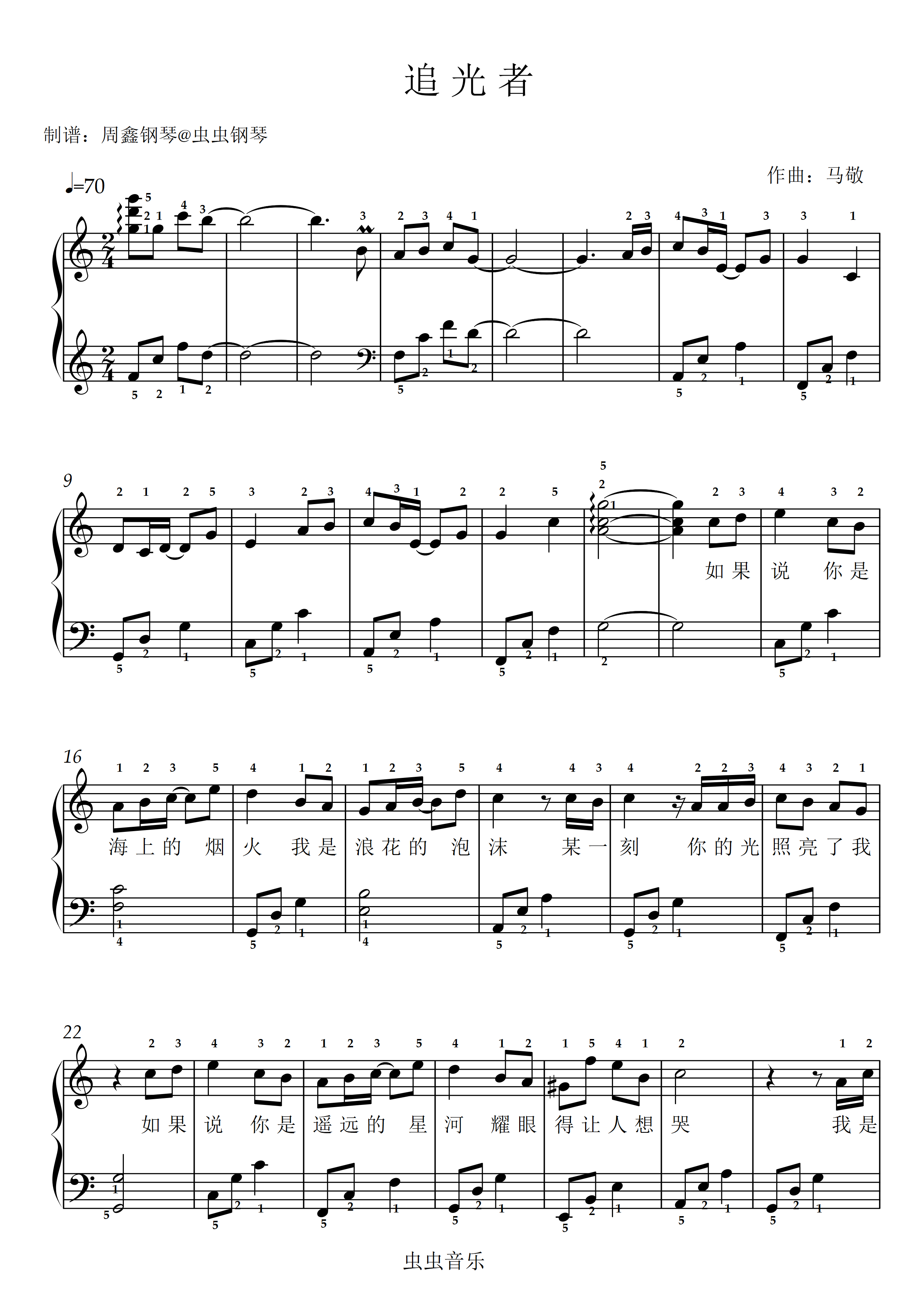 钢琴谱:《追光者》C大调 带歌词 带指法 简单版