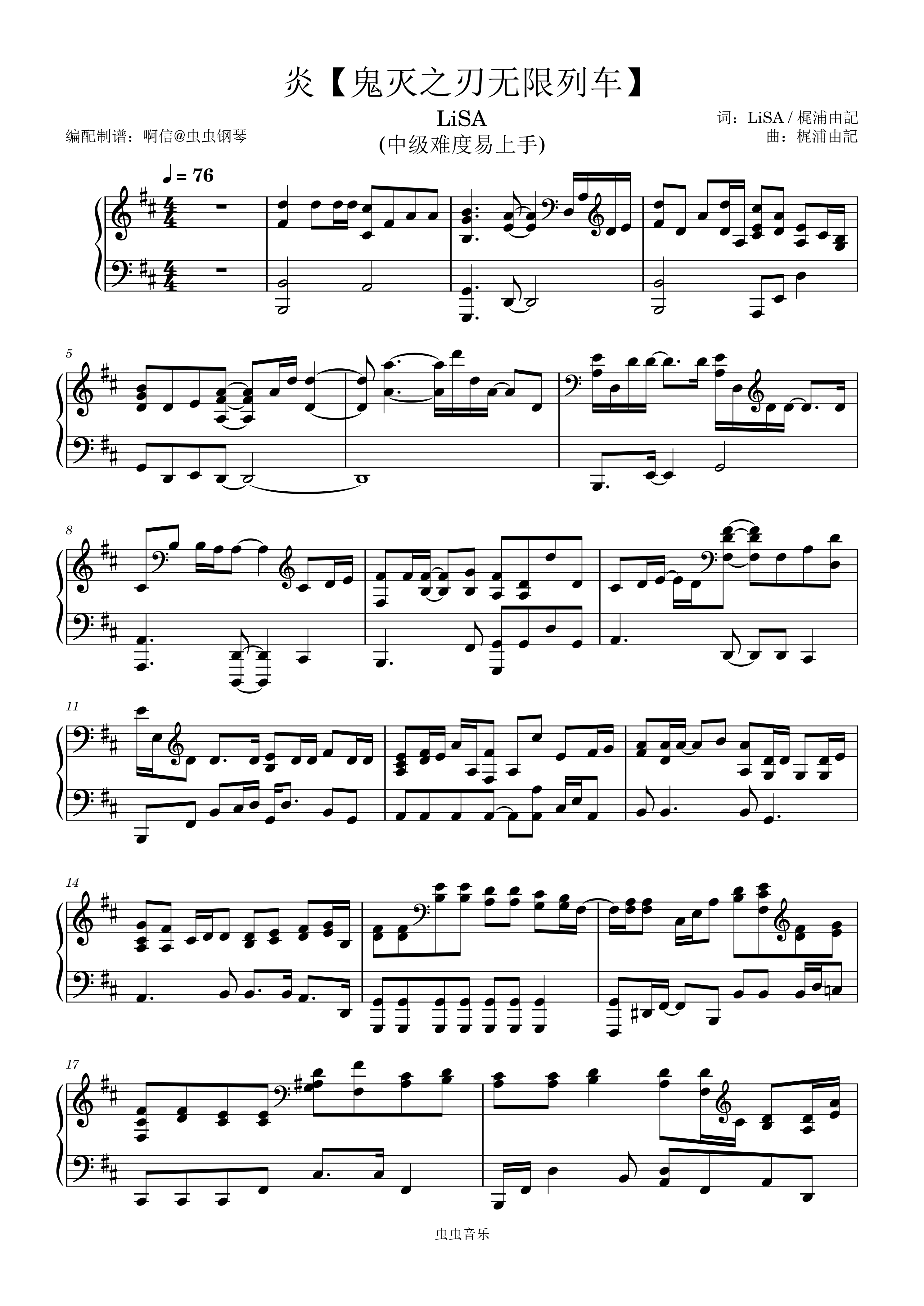 • 炎钢琴简谱 D调 数字双手 梶浦由記/LiSA