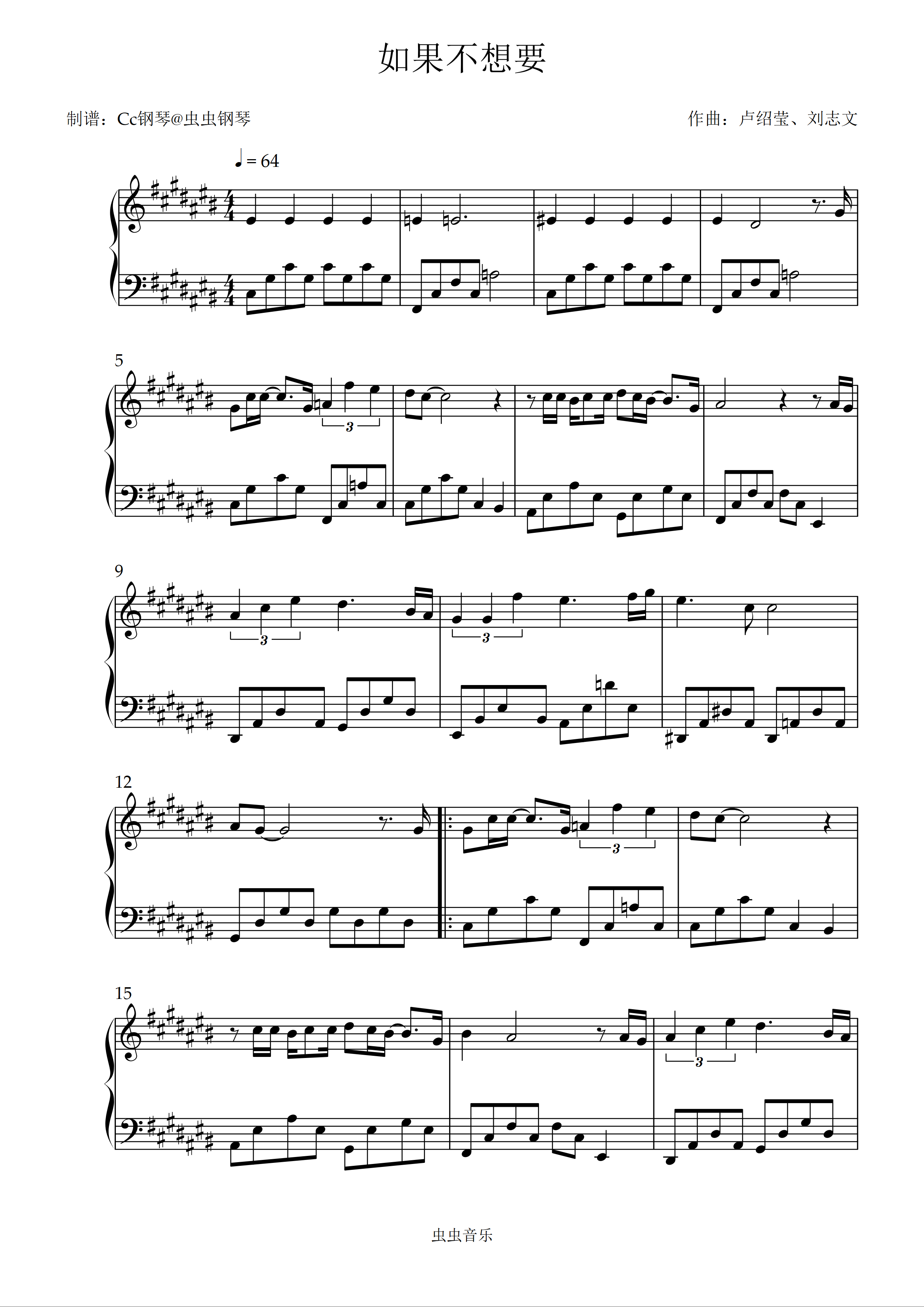 • 想着你钢琴简谱 E调 数字双手 郭顶