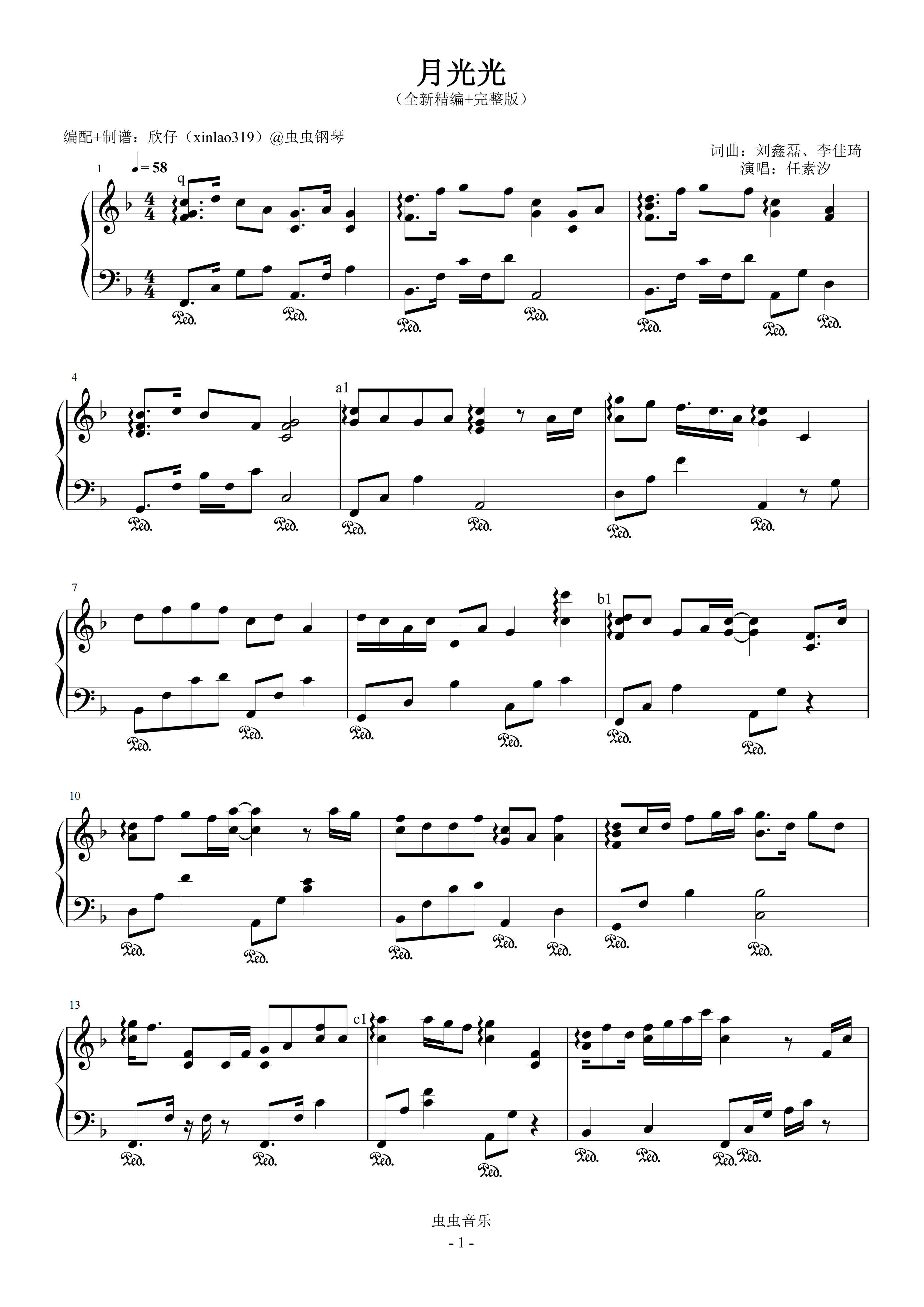 月光光钢琴简谱 数字双手 刘鑫磊、李佳琦