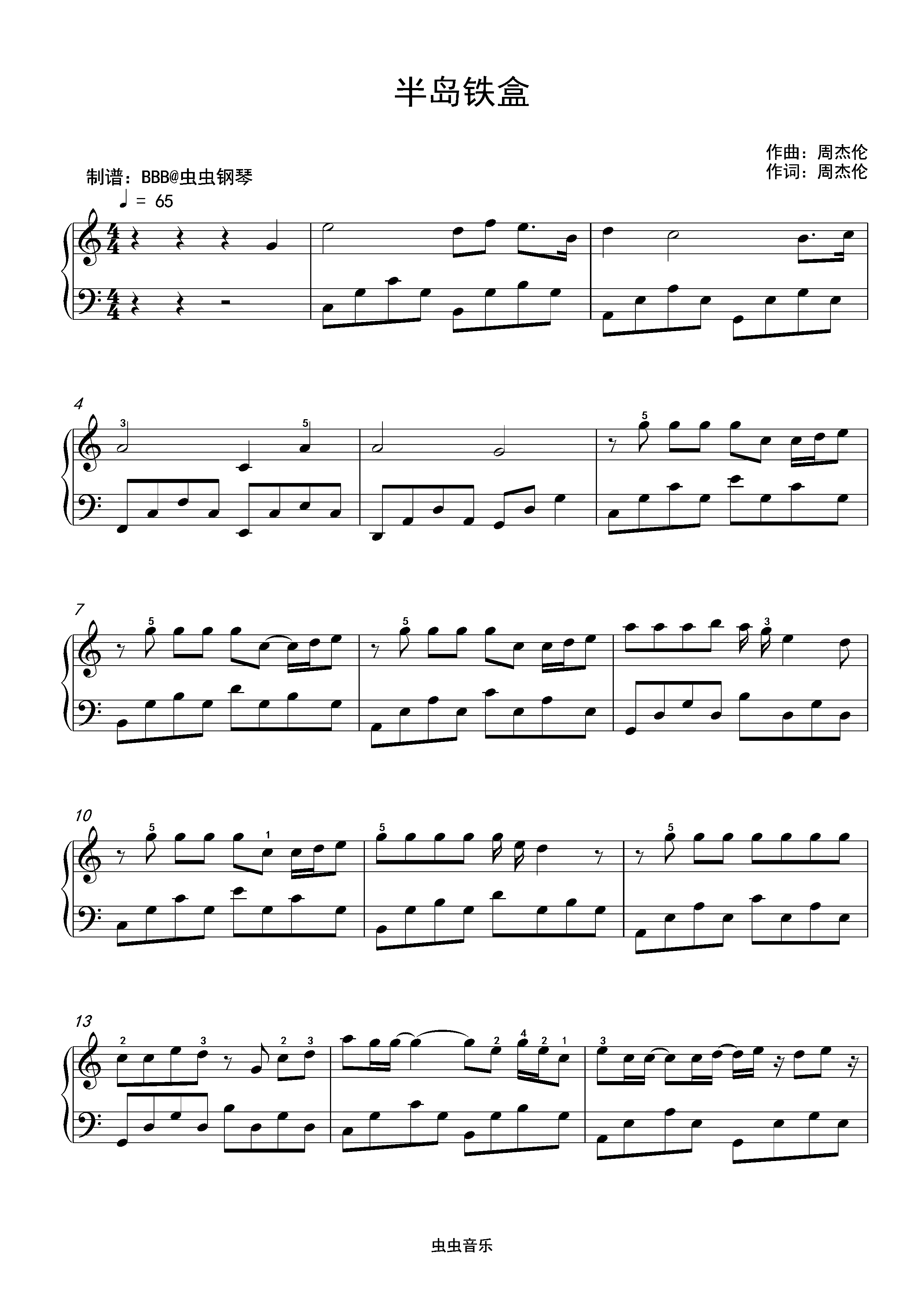• 半岛铁盒钢琴简谱 Bb调 数字双手 周杰伦