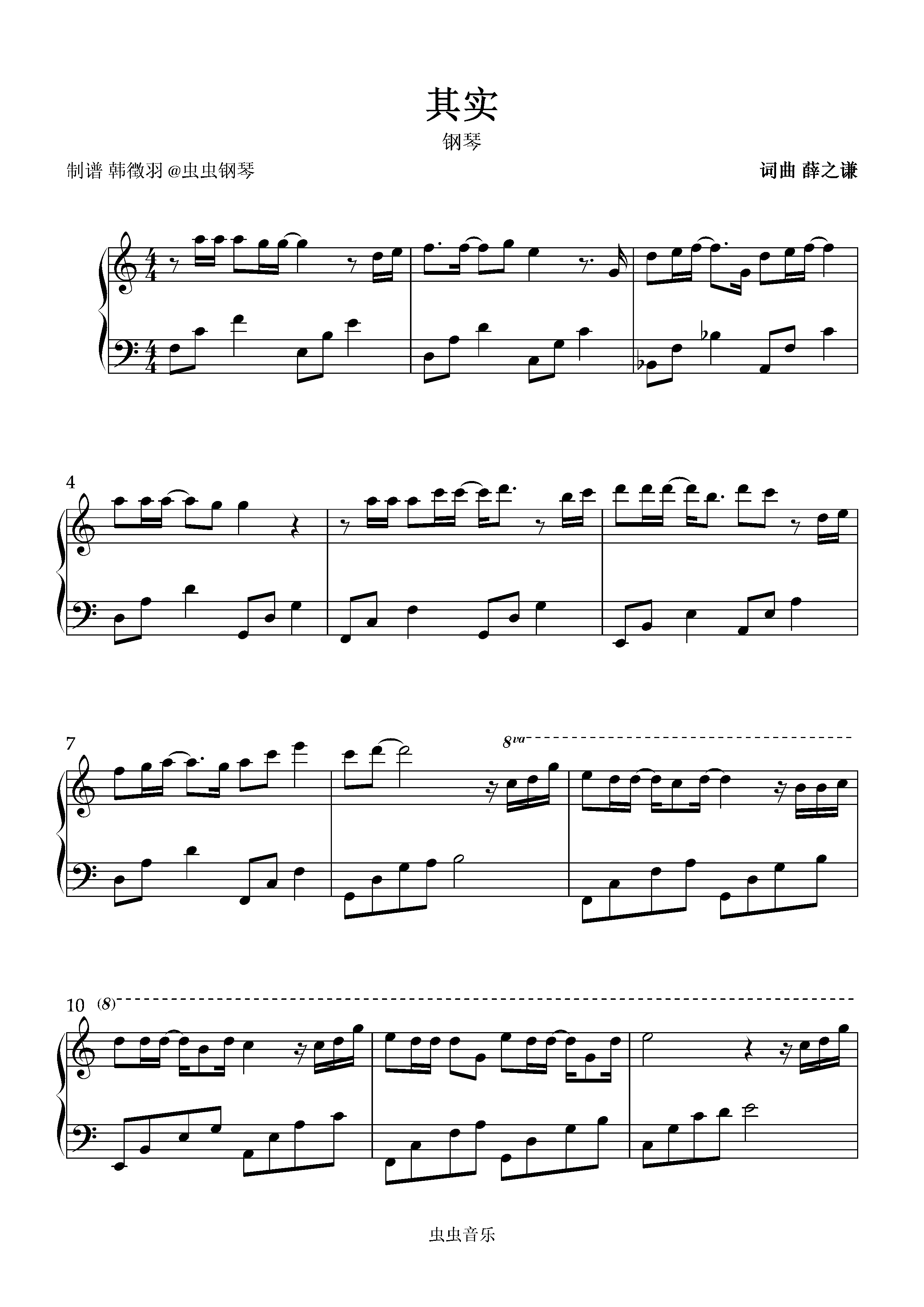 • 其实钢琴简谱 C调 数字双手 薛之谦