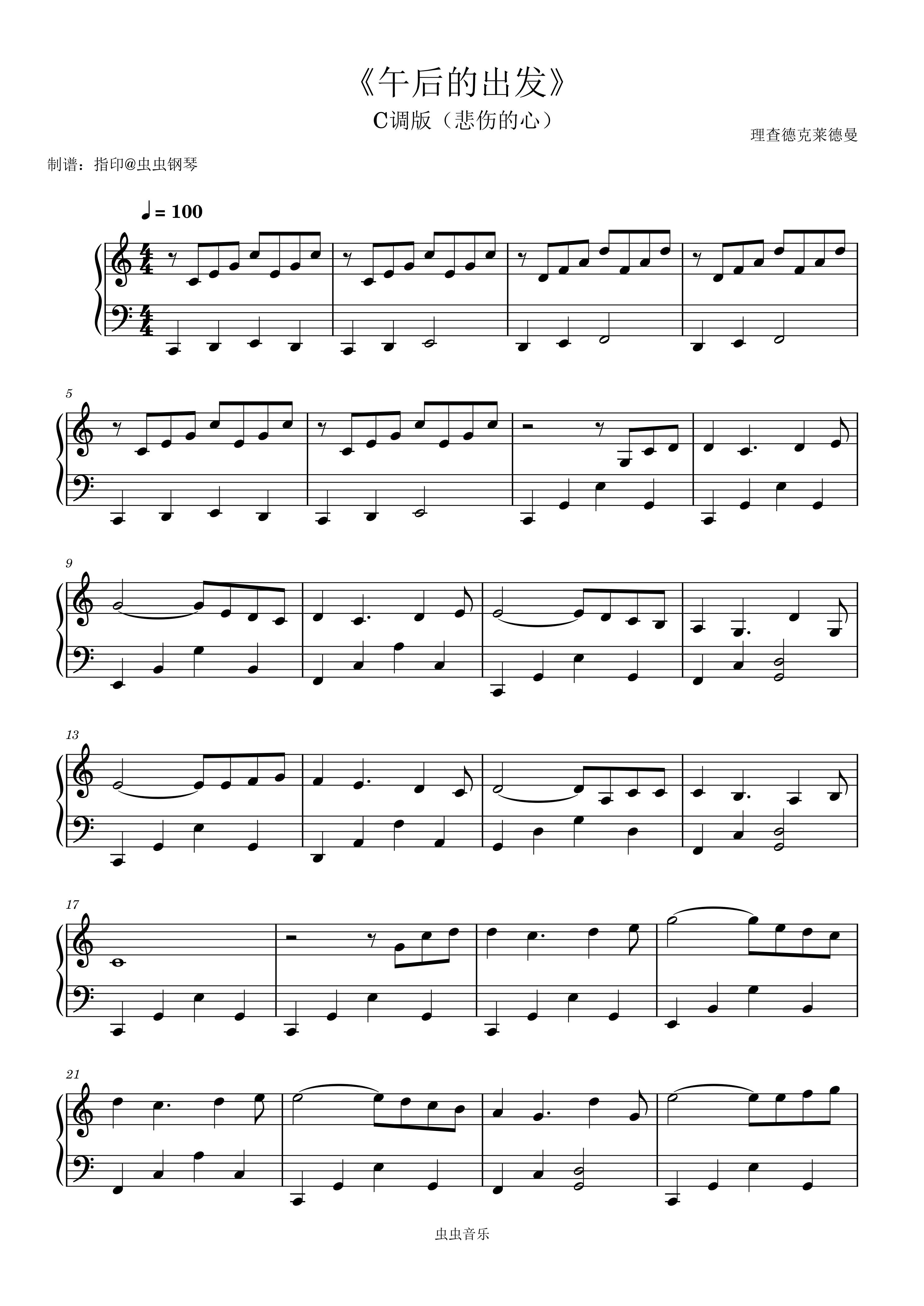 钢琴谱:C调版《午后的出发》(悲伤的心)