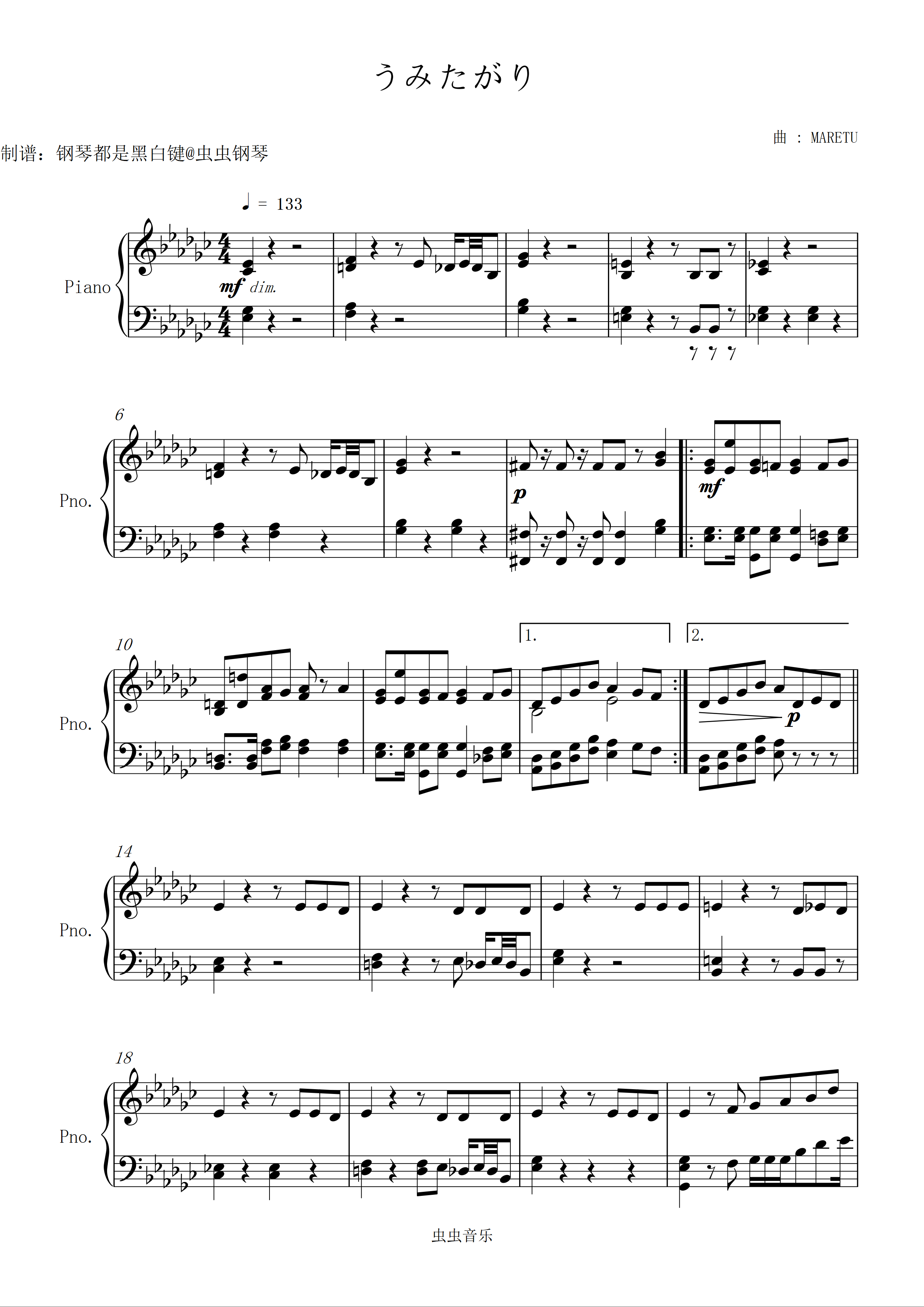 钢琴谱:【 初音ミク】渴望诞生/うみたがり
