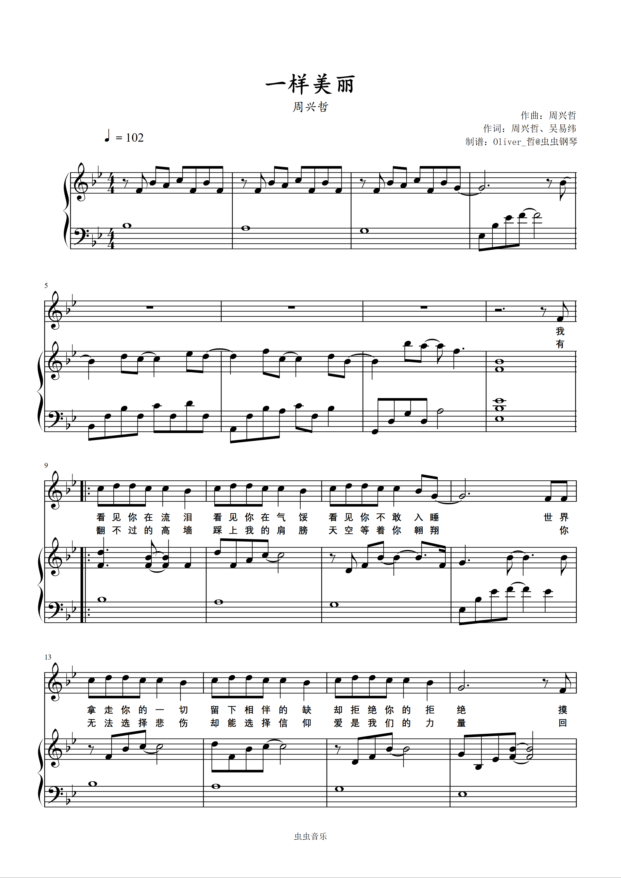 一样美丽钢琴简谱 数字双手 周兴哲/吴易纬
