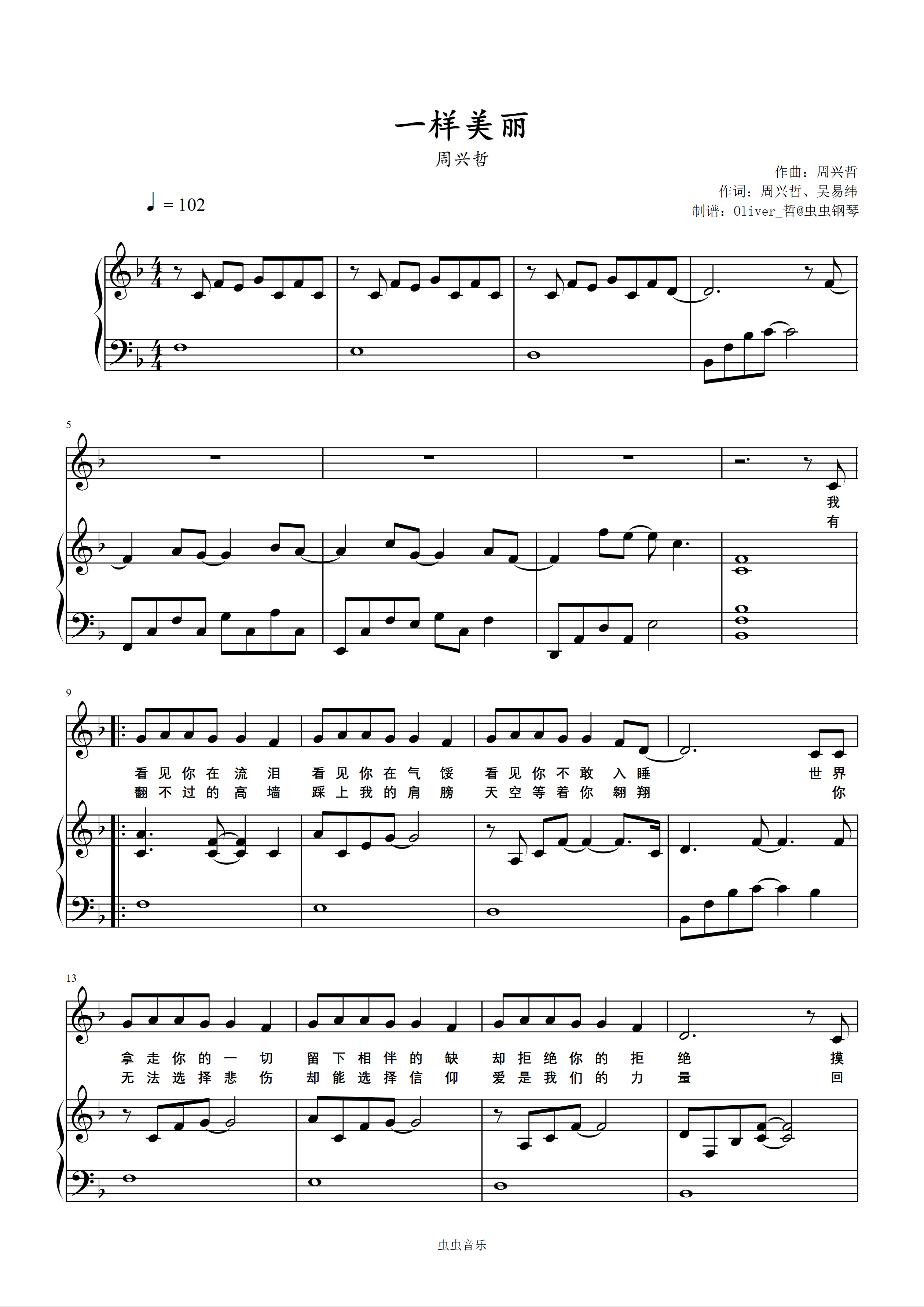 一样美丽钢琴简谱 数字双手 周兴哲/吴易纬
