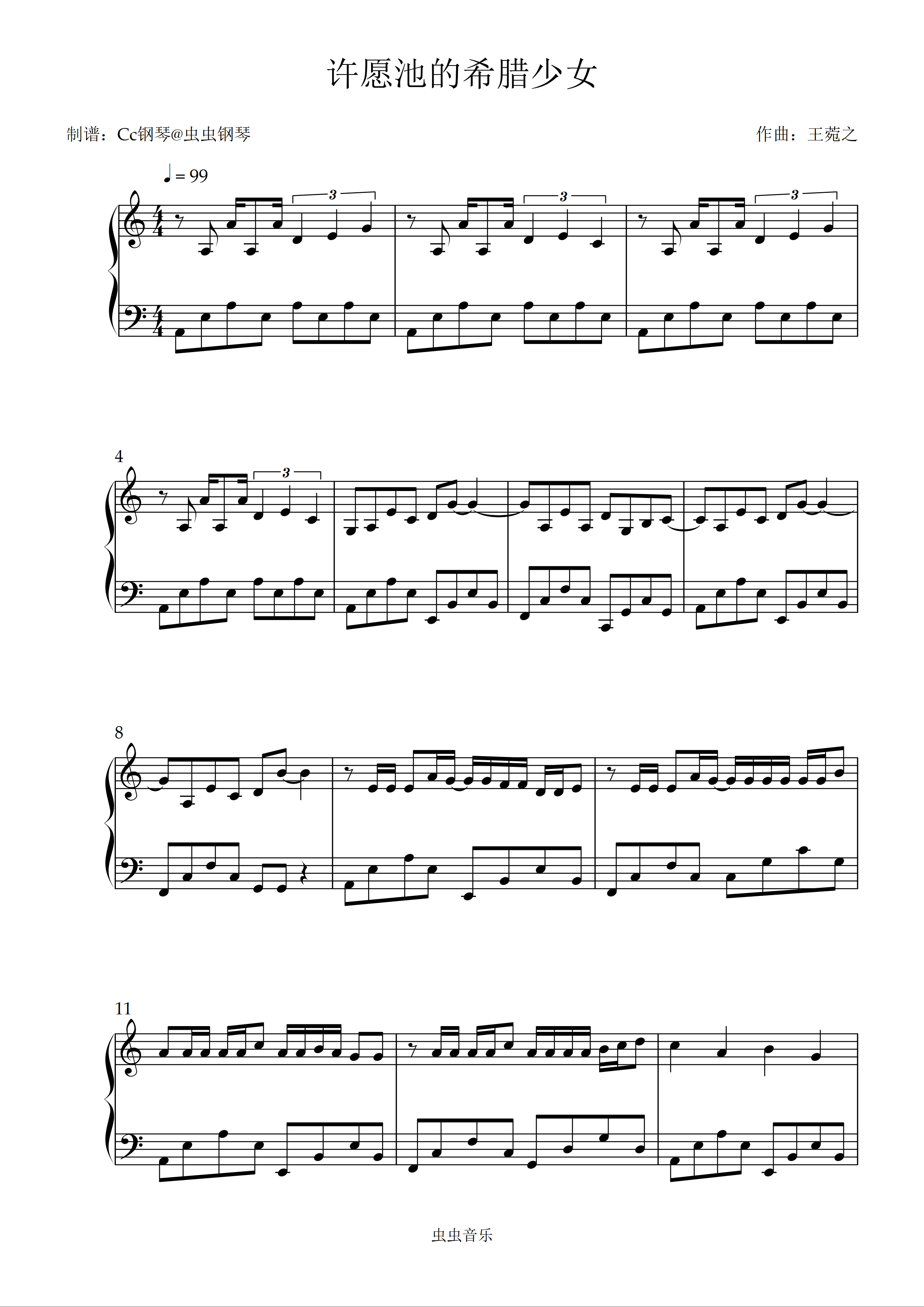 钢琴谱:许愿池的希腊少女 C调 好听易上手