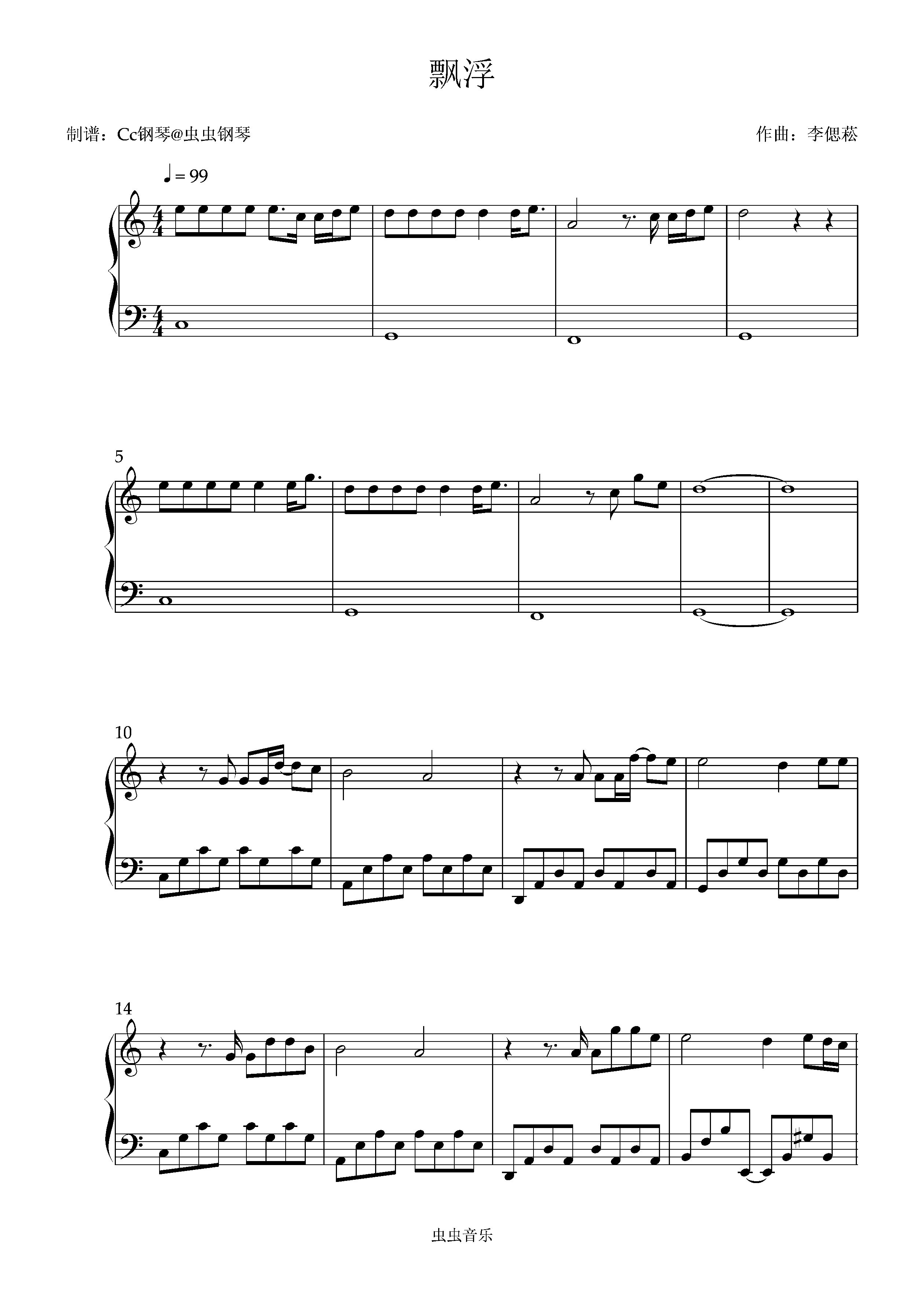 钢琴谱:飘浮 C调 好听易上手