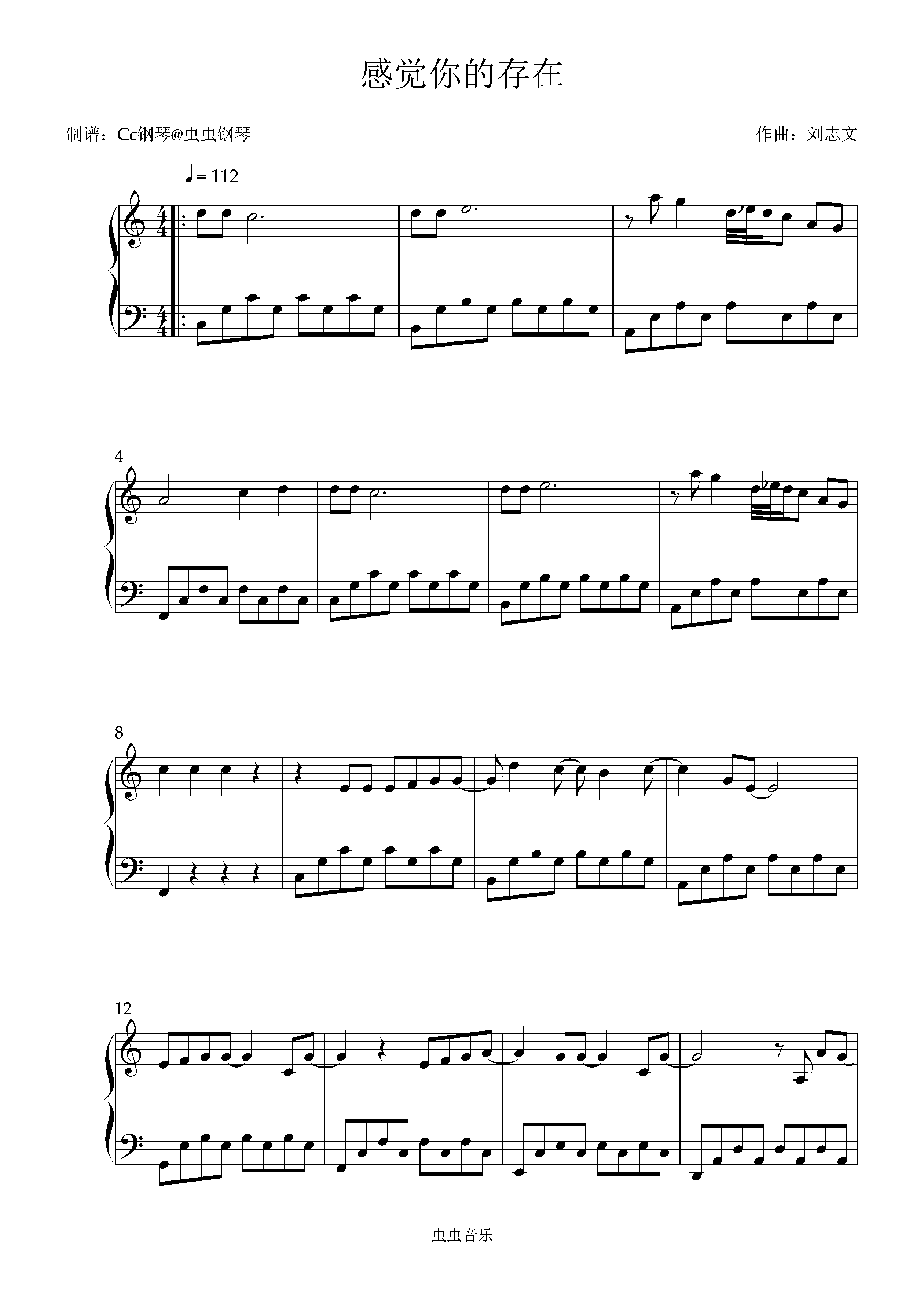 钢琴谱:感觉你的存在 C调 好听易上手