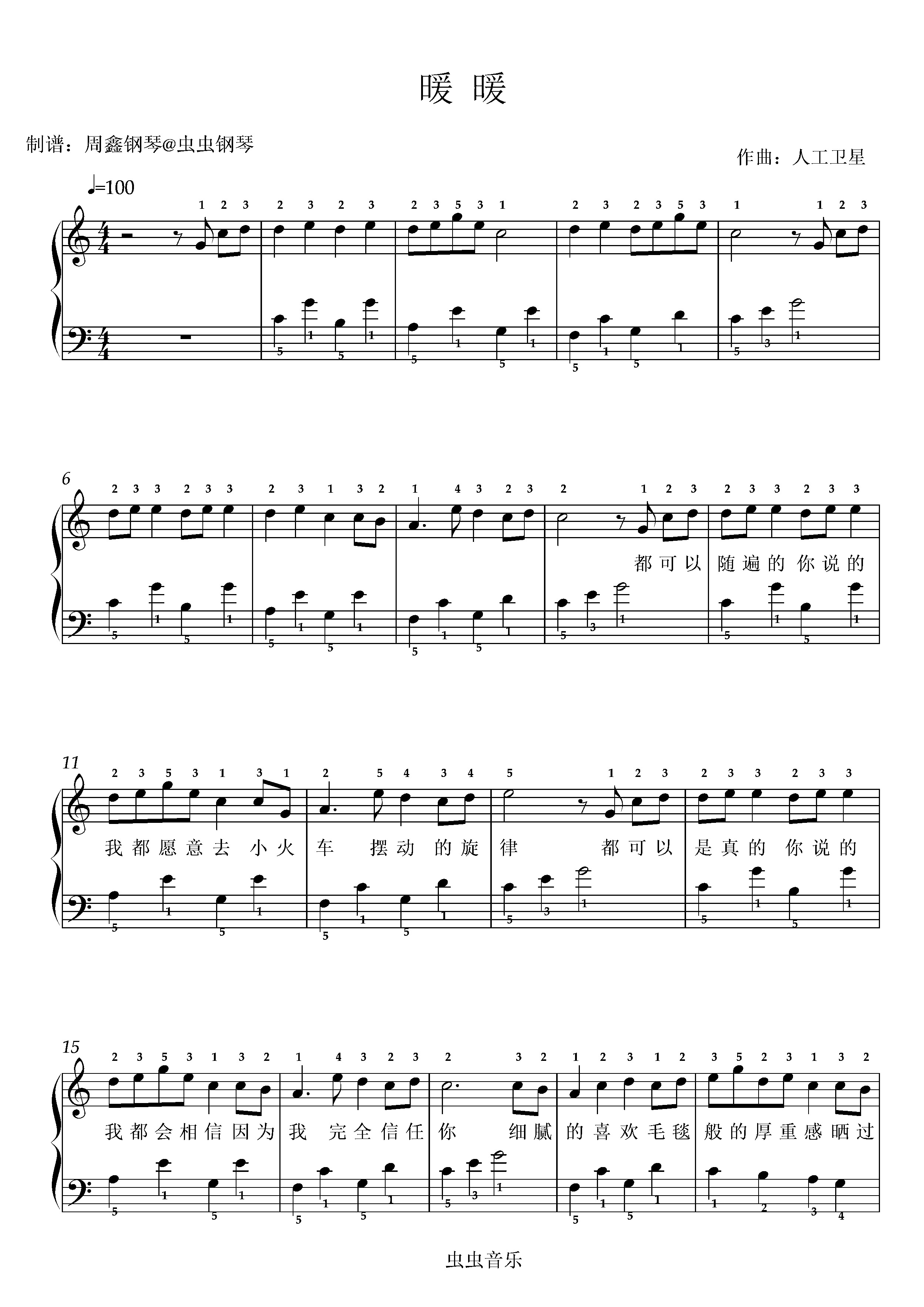 钢琴谱:《暖暖》C调 带指法 带歌词 简单版