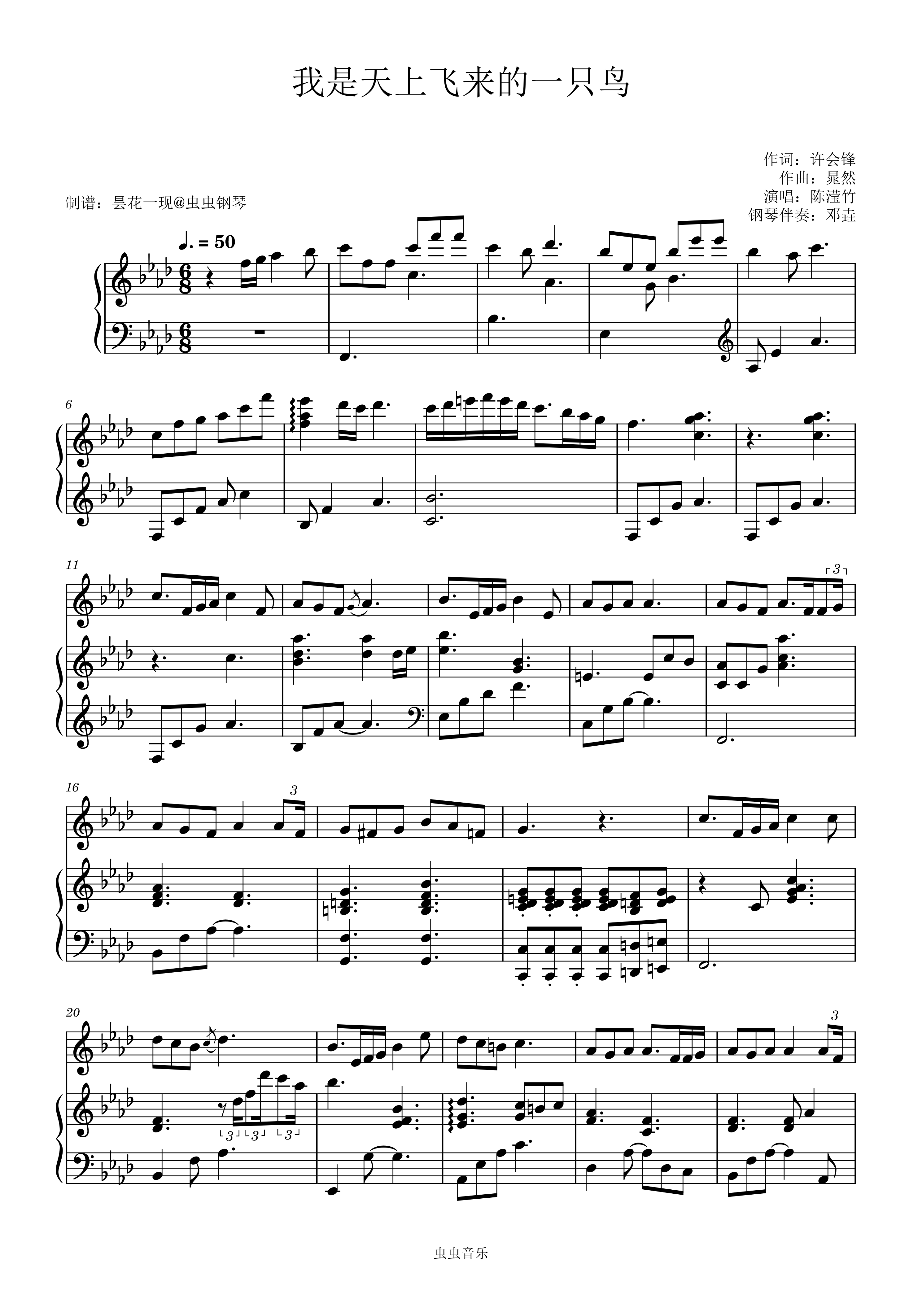 钢琴谱:我是天上飞来的一只鸟 邓垚伴奏陈滢竹演唱