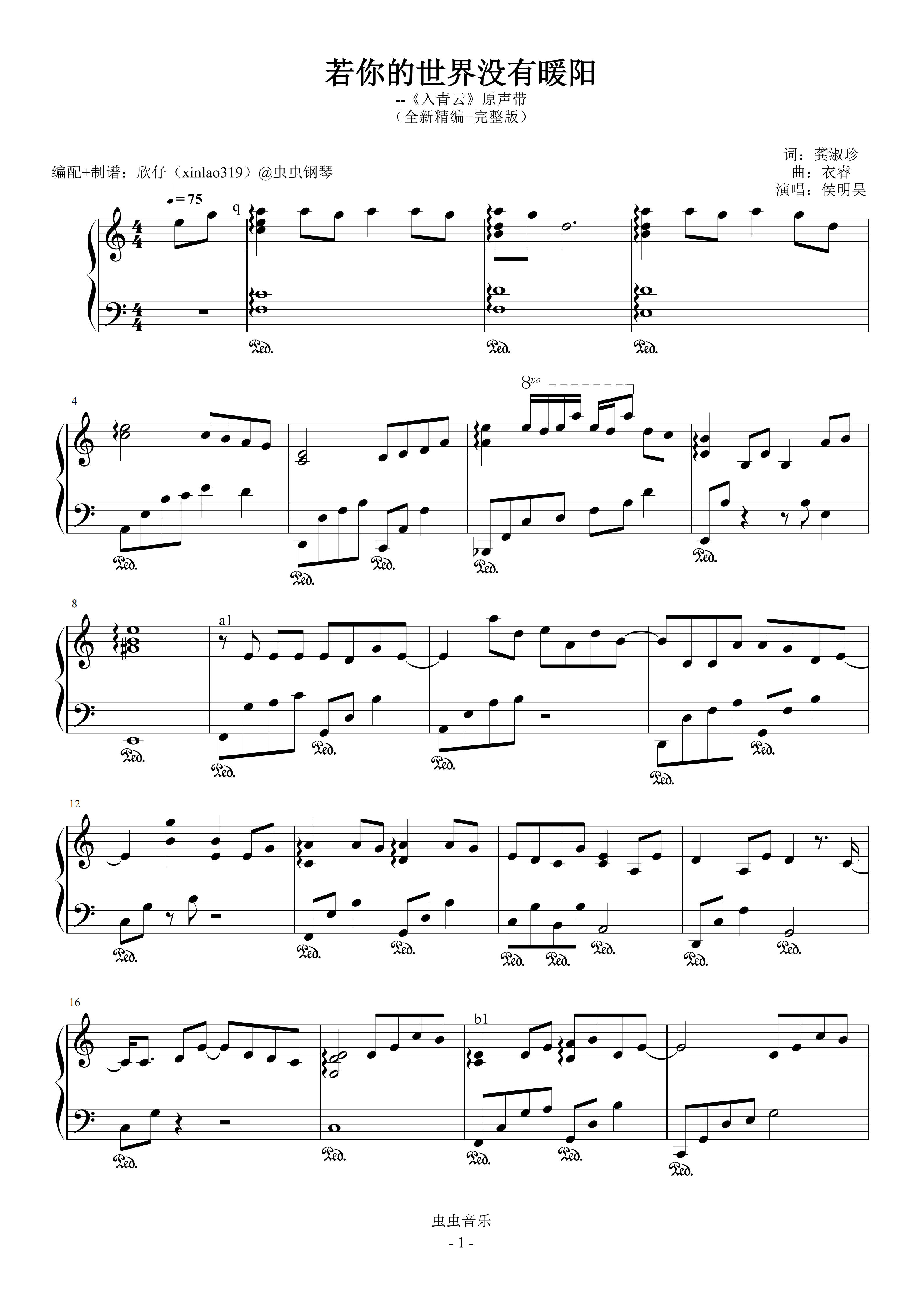 钢琴谱:若你的世界没有暖阳(C、侯明昊、完整版)