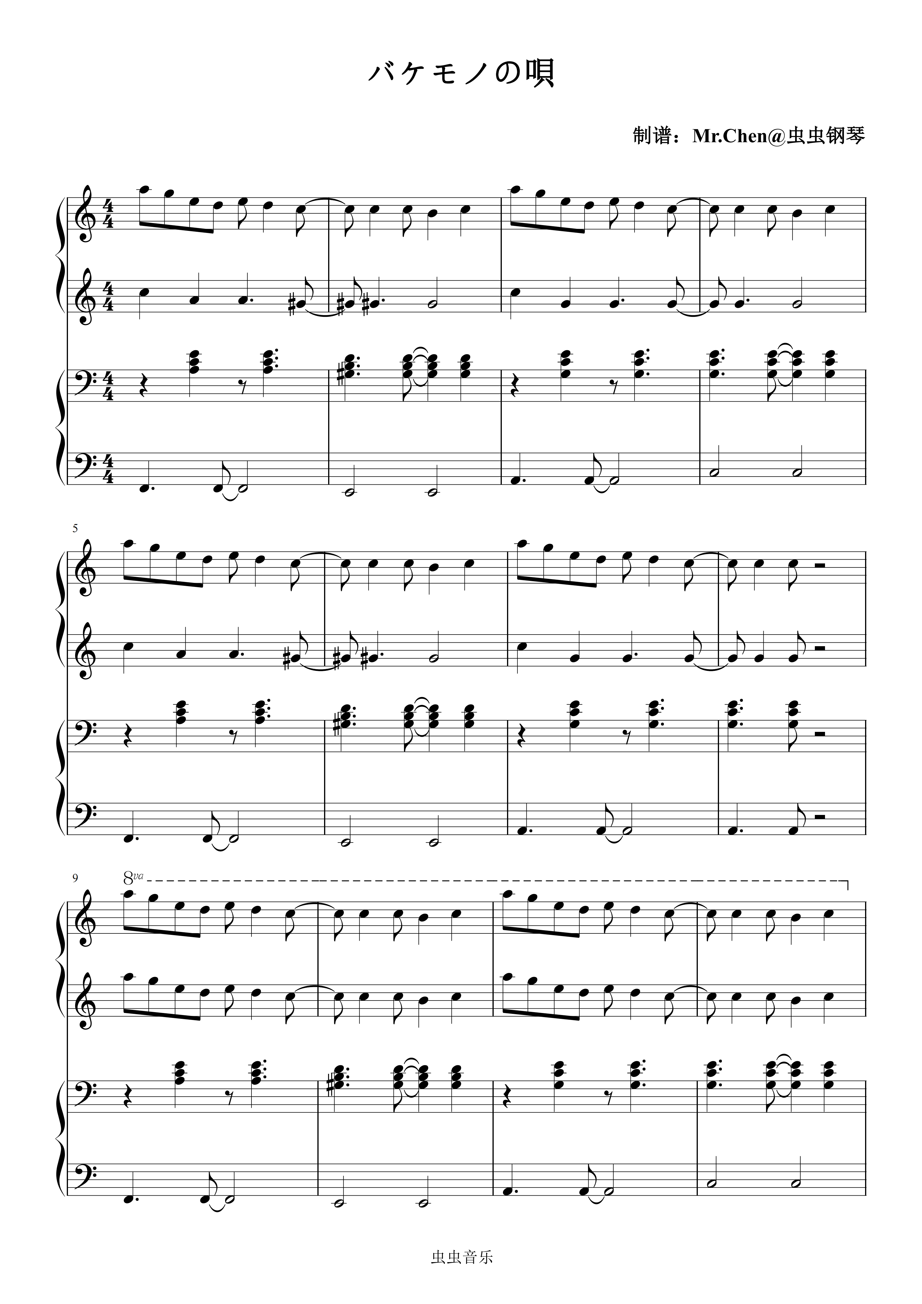 钢琴谱:怪物之歌 (四手联弹)- バケモノの唄 初音未来