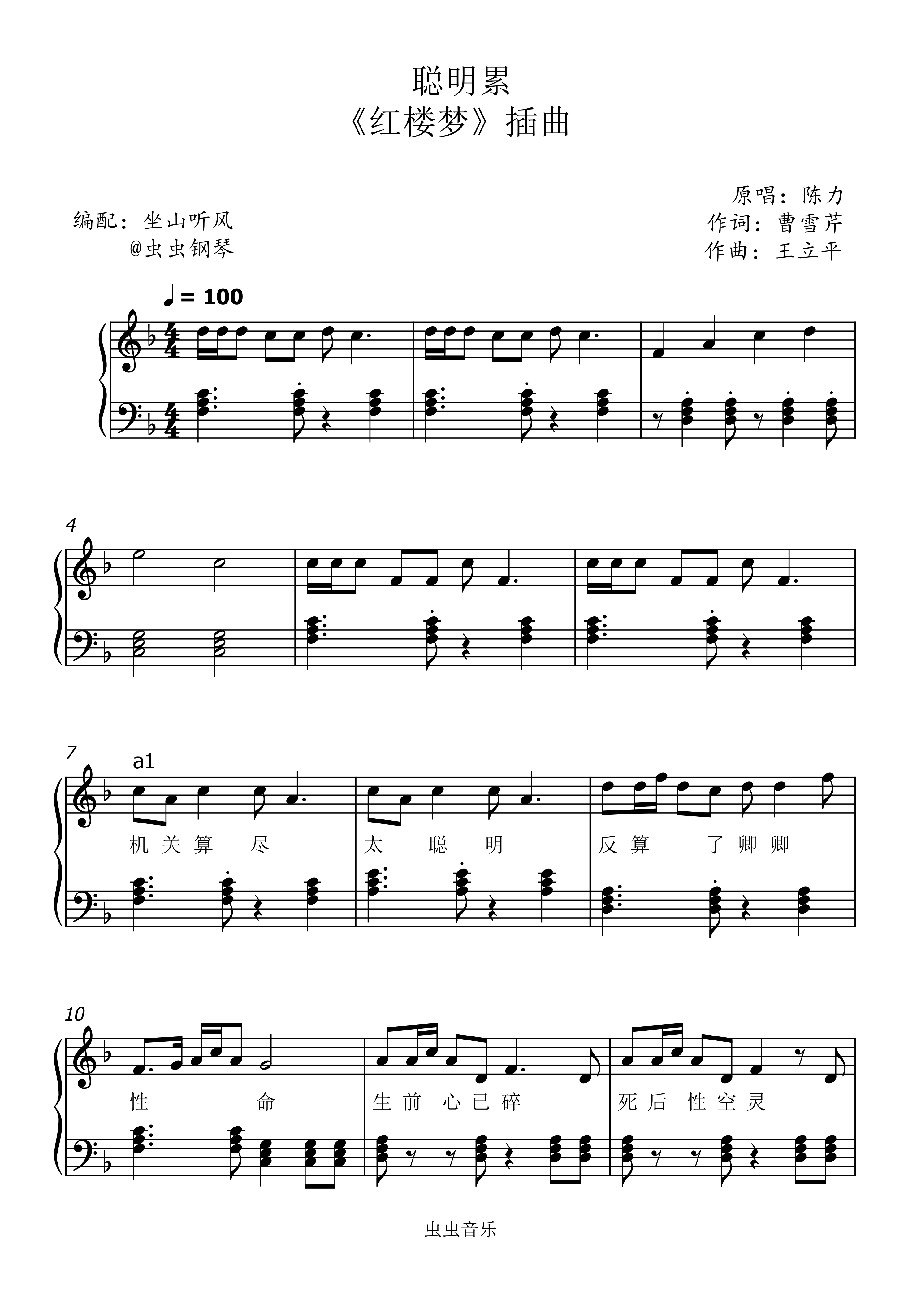 • 聪明累钢琴简谱 D调 数字双手 曹雪芹