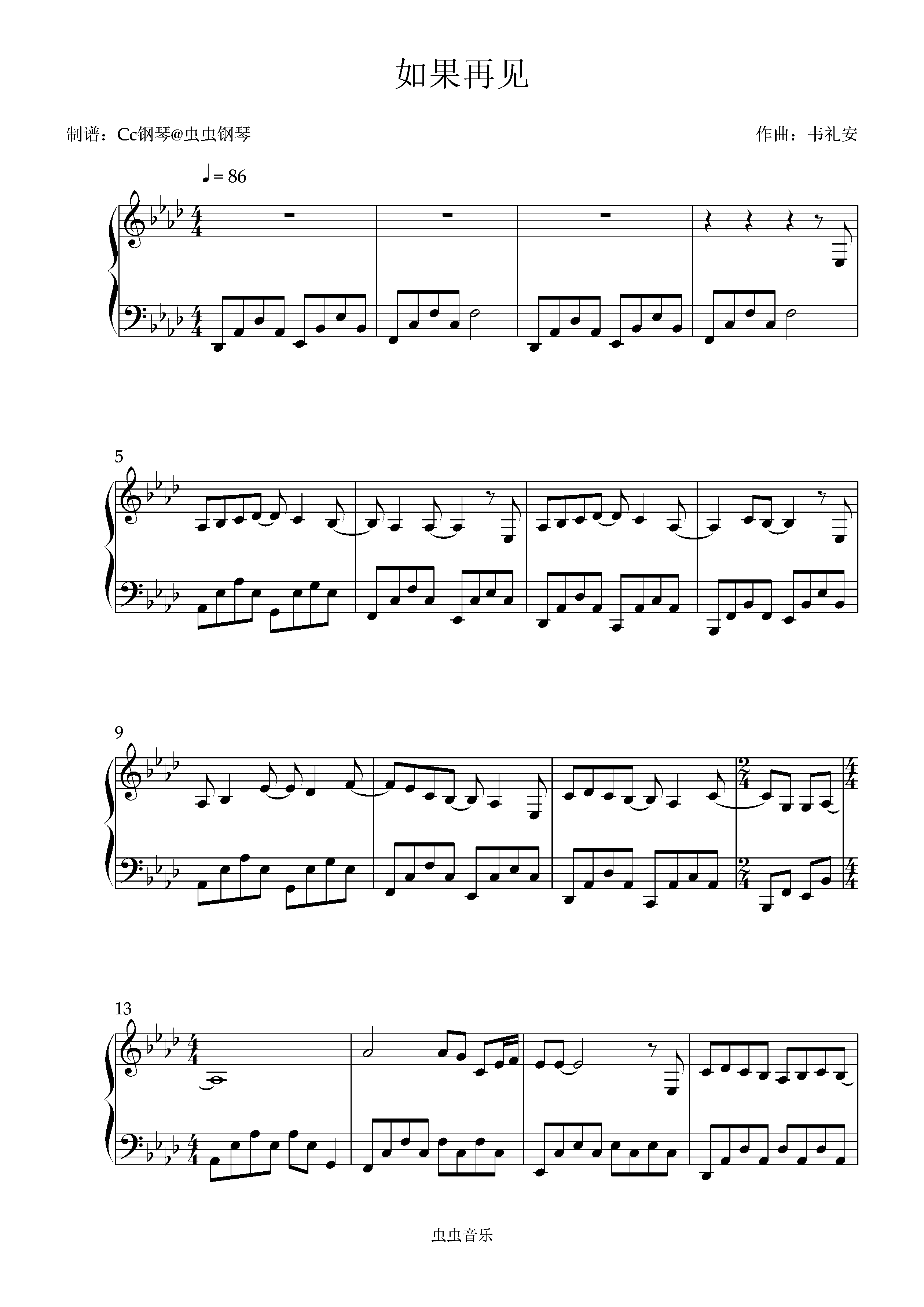 • 再见钢琴简谱 C调 数字双手 张震岳
