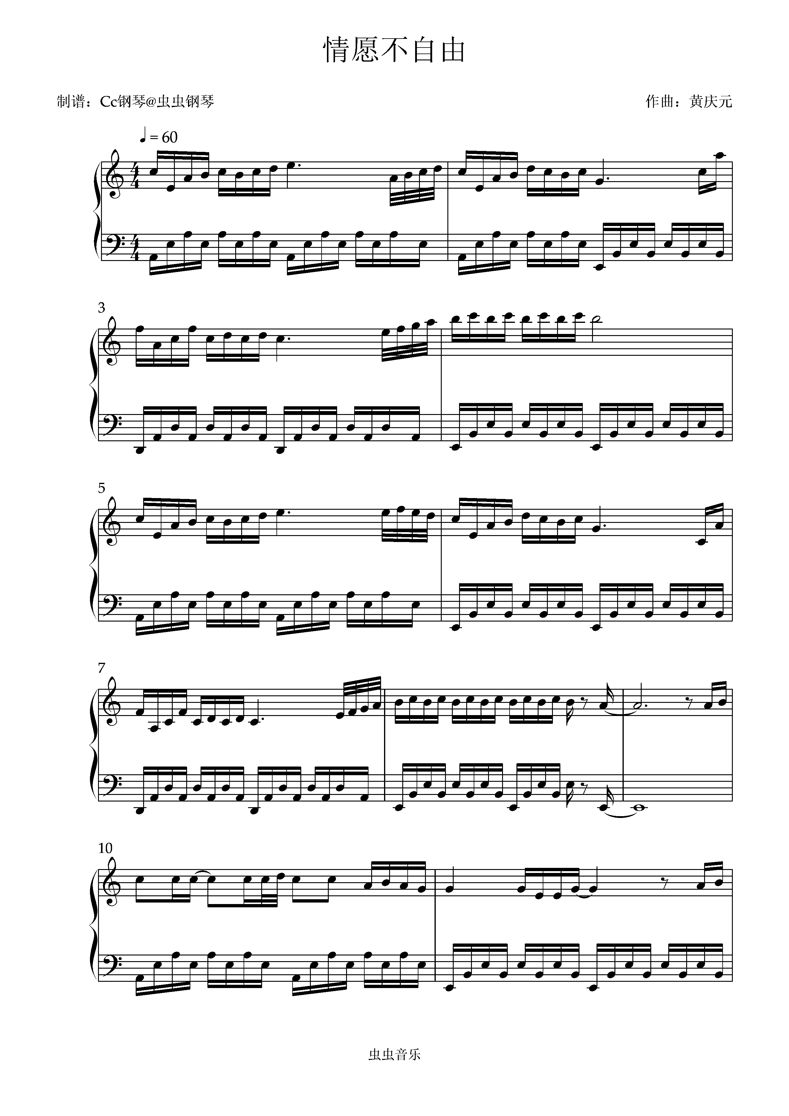 情愿不自由钢琴简谱 数字双手 陈乐融、丁晓雯