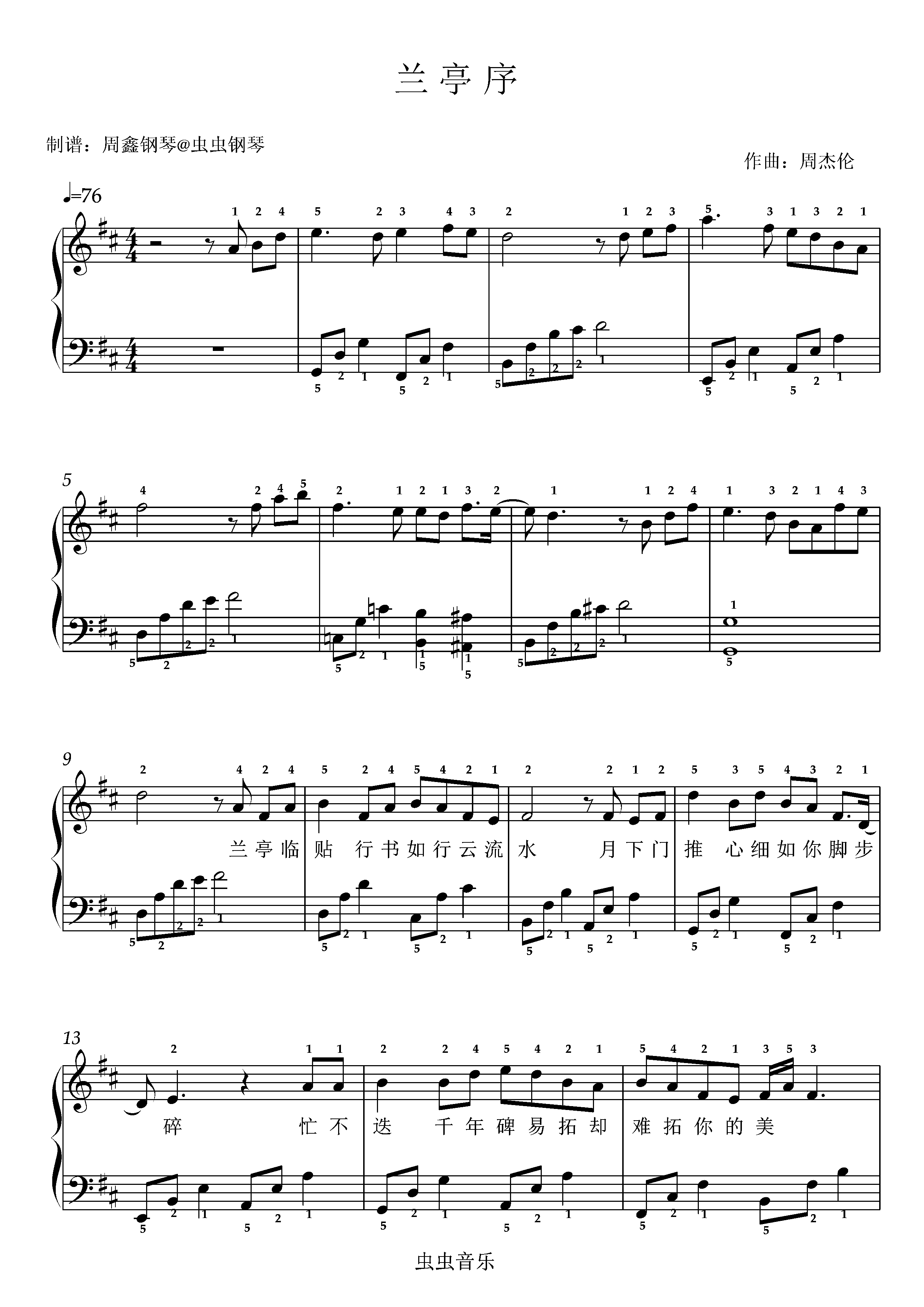 钢琴谱:《兰亭序》D调 带歌词 带指法 简单版