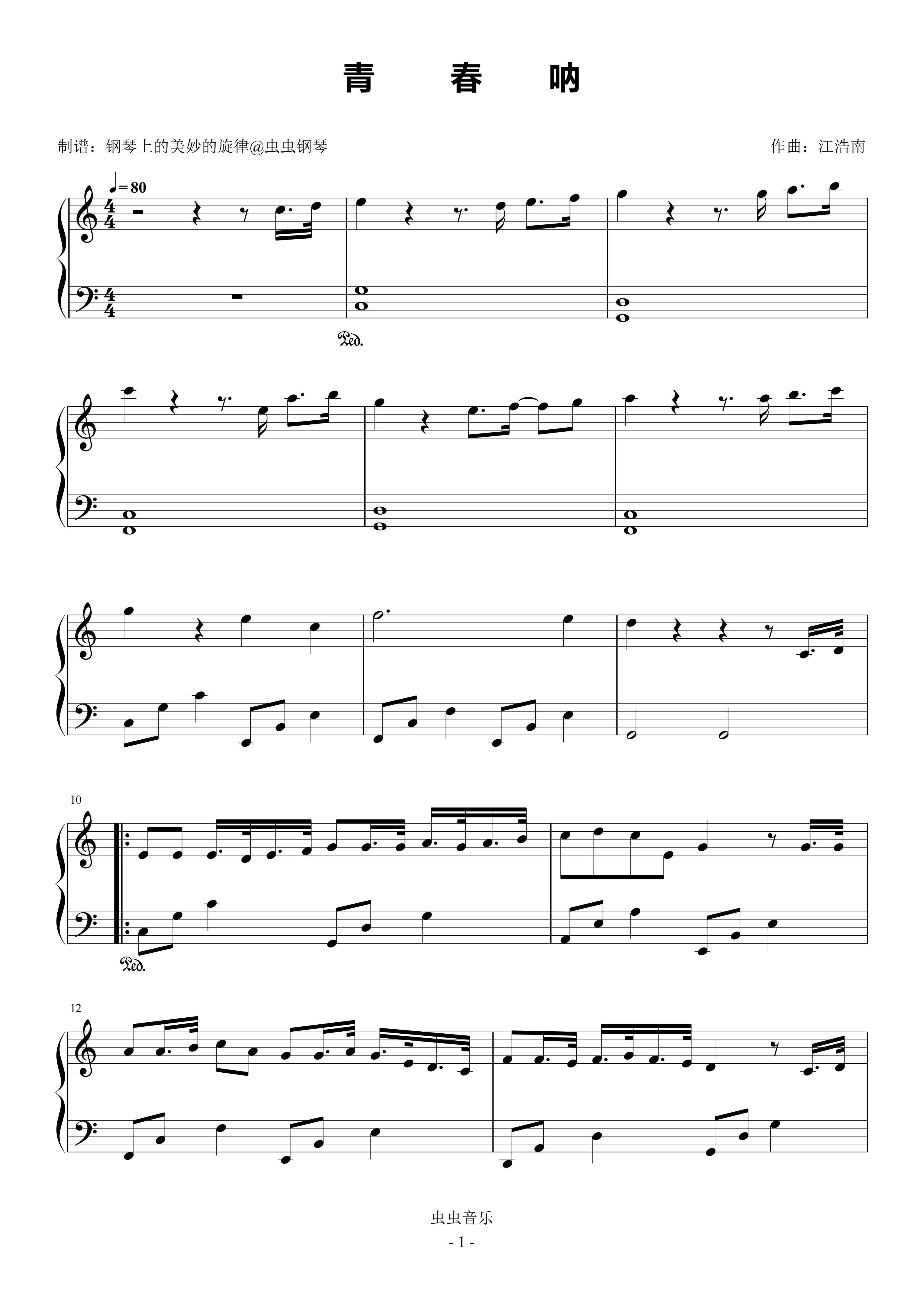 钢琴谱:青春呐 C调简易版 刘宇宁