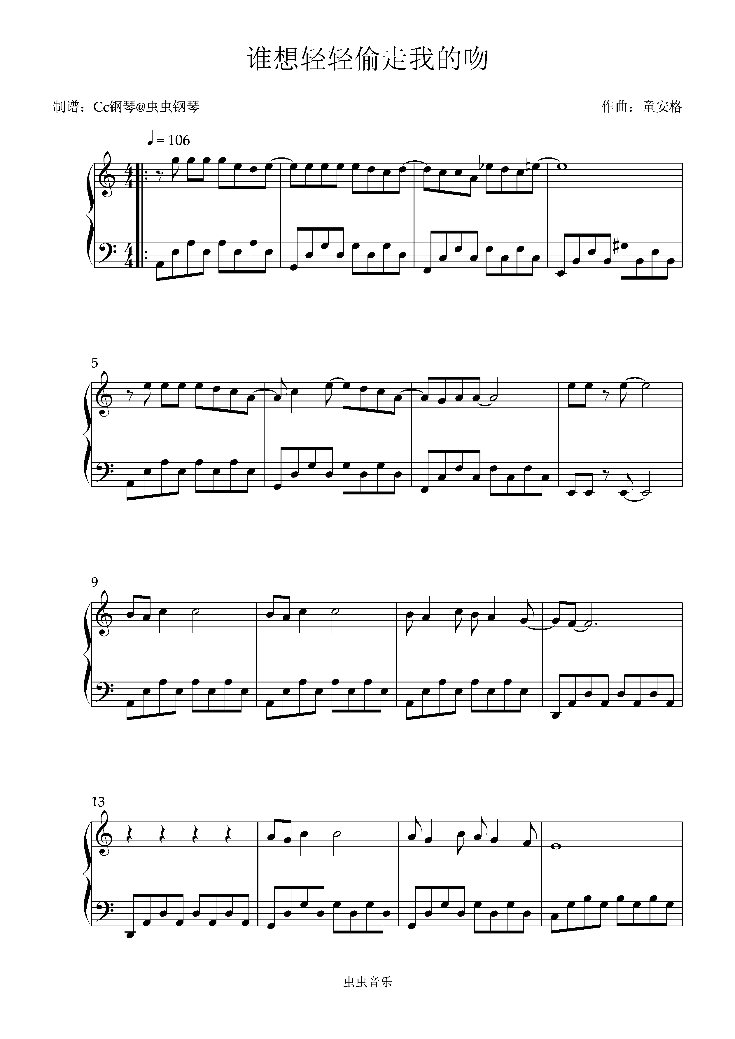 钢琴谱:谁想轻轻偷走我的吻 C调 好听易上手