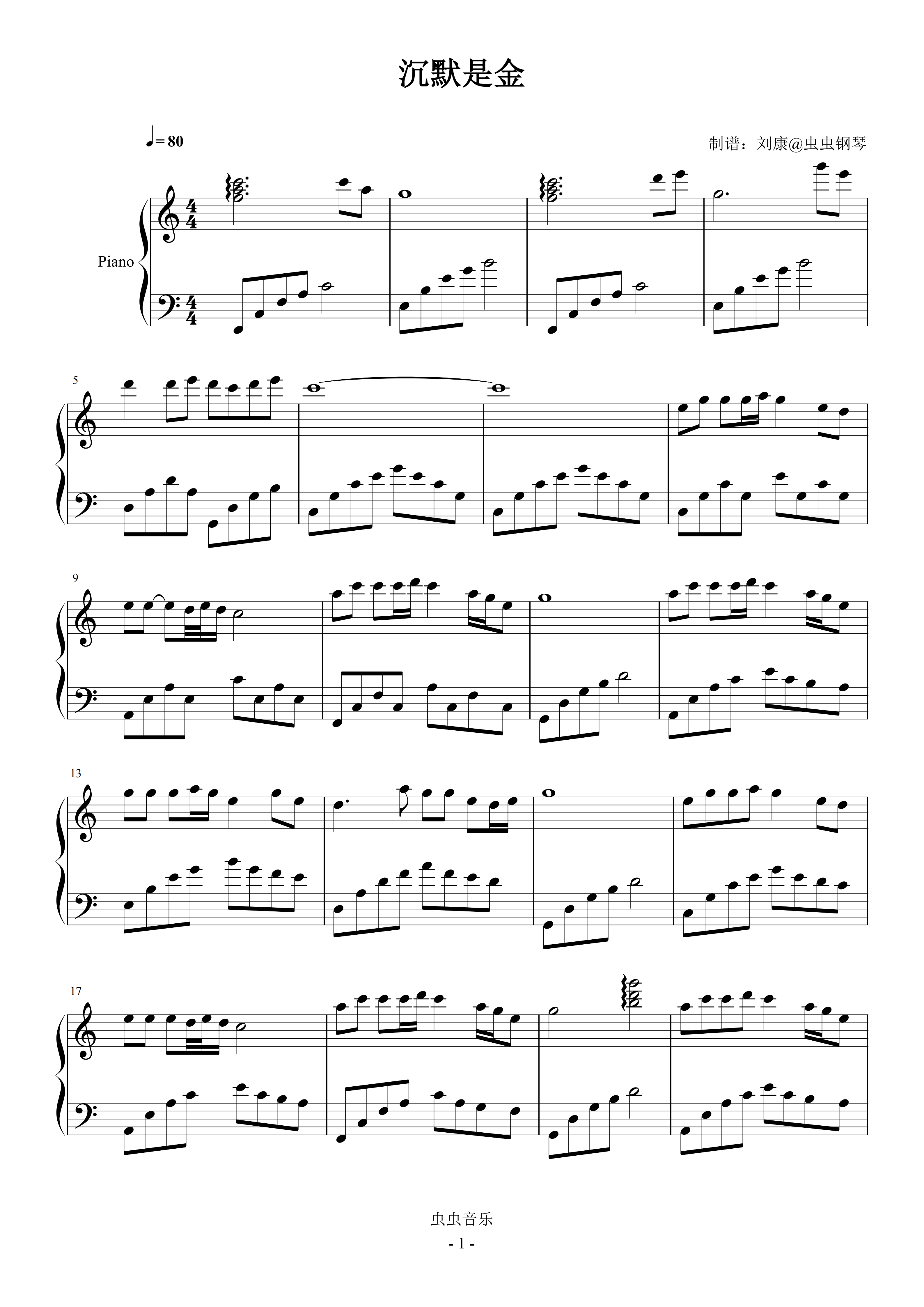 • 沉默是金钢琴简谱 C调 数字双手 许冠杰