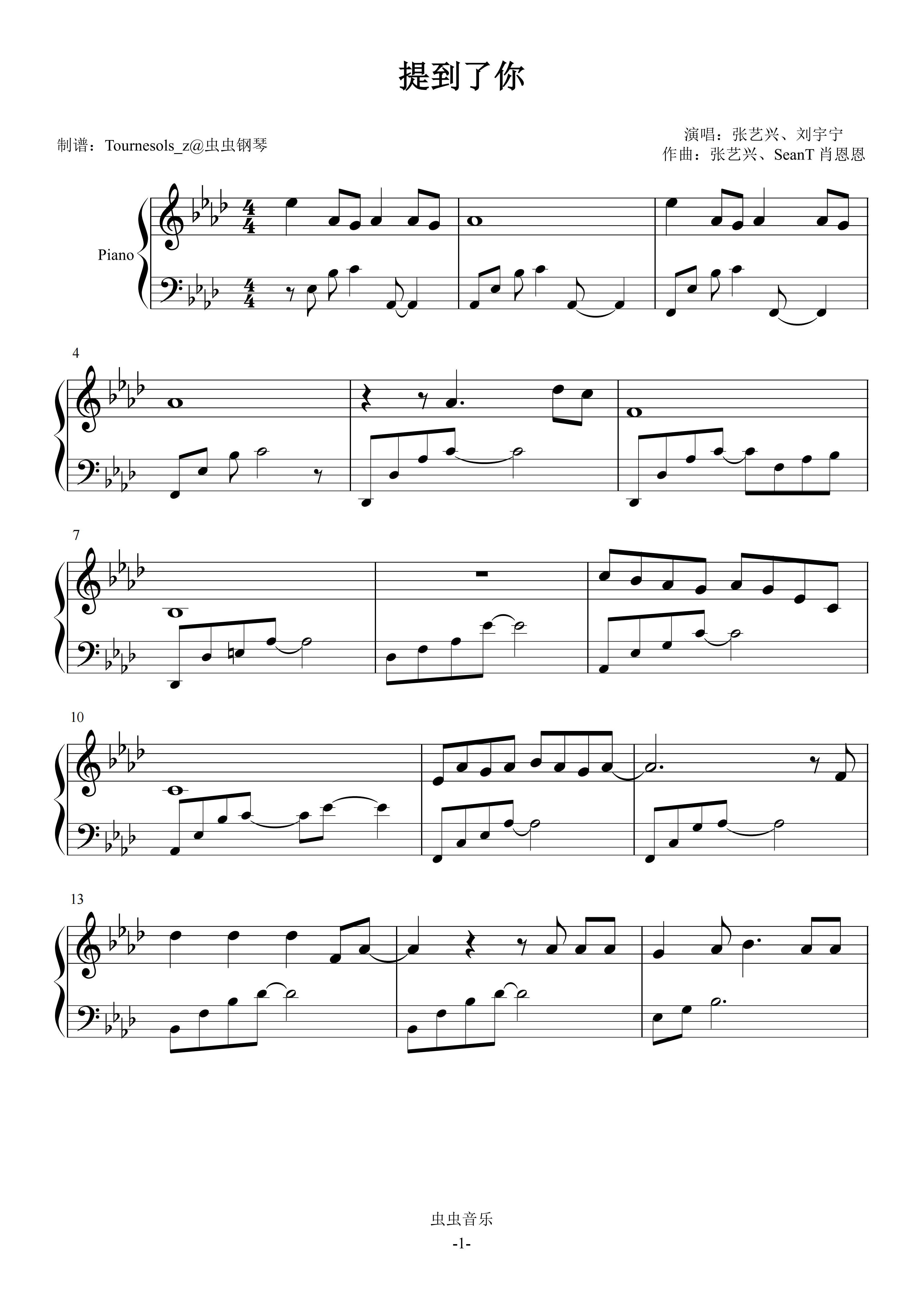 钢琴谱:提到了你(张艺兴、Feat.刘宇宁)