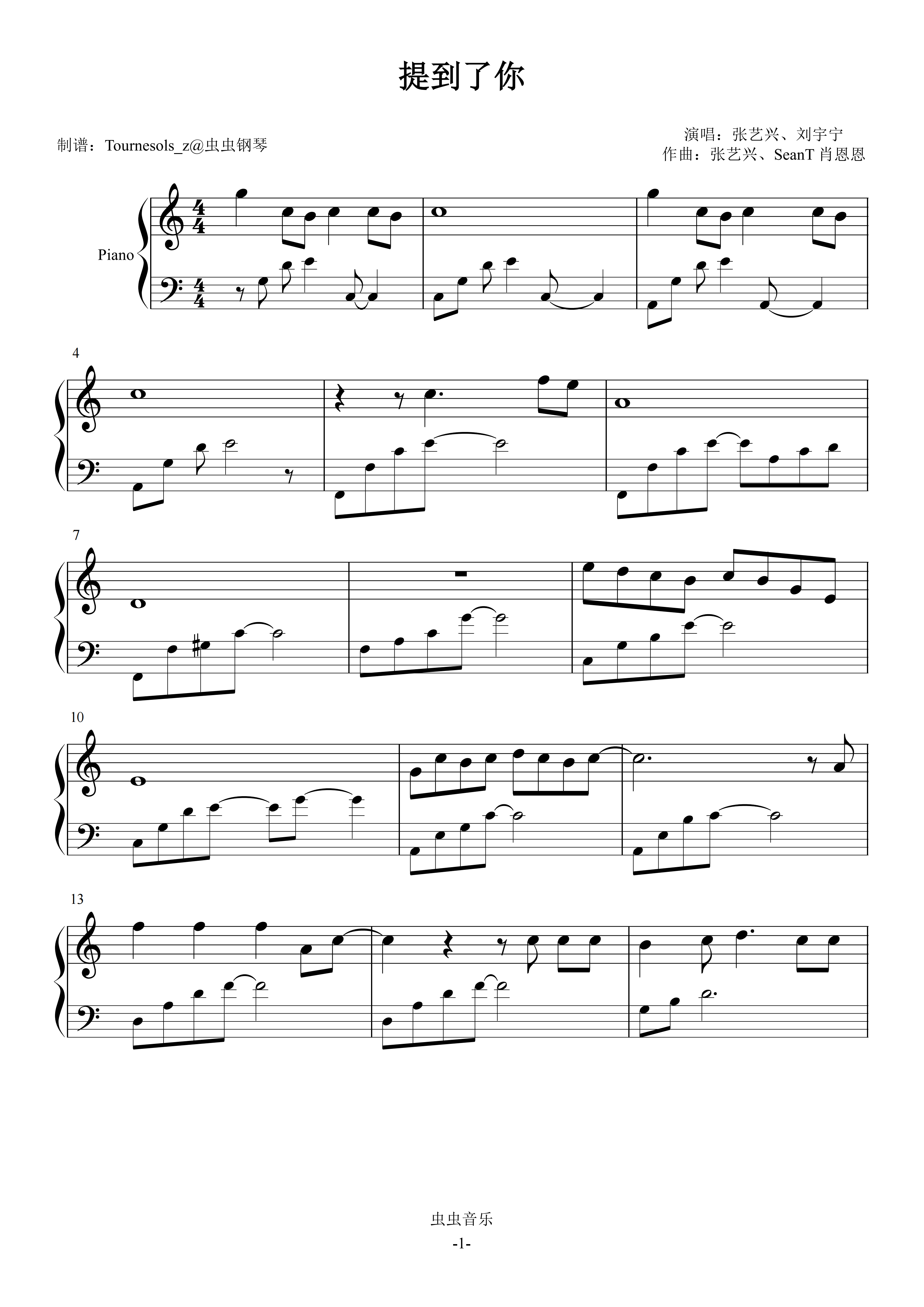 钢琴谱:提到了你(C调,张艺兴,Feat.刘宇宁)