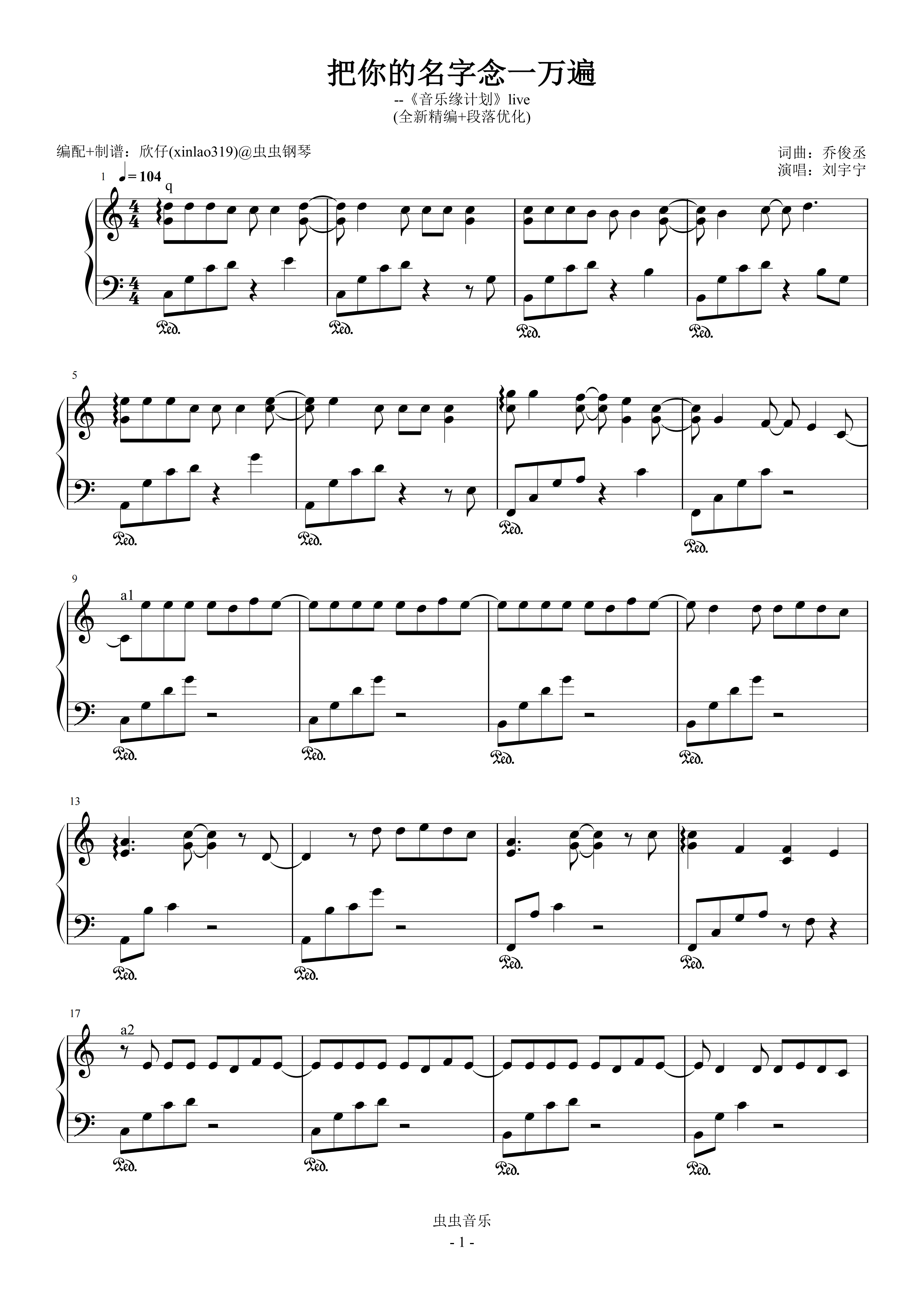 钢琴谱:把你的名字念一万遍(C、刘宇宁《音乐缘计划》live、段落优化)