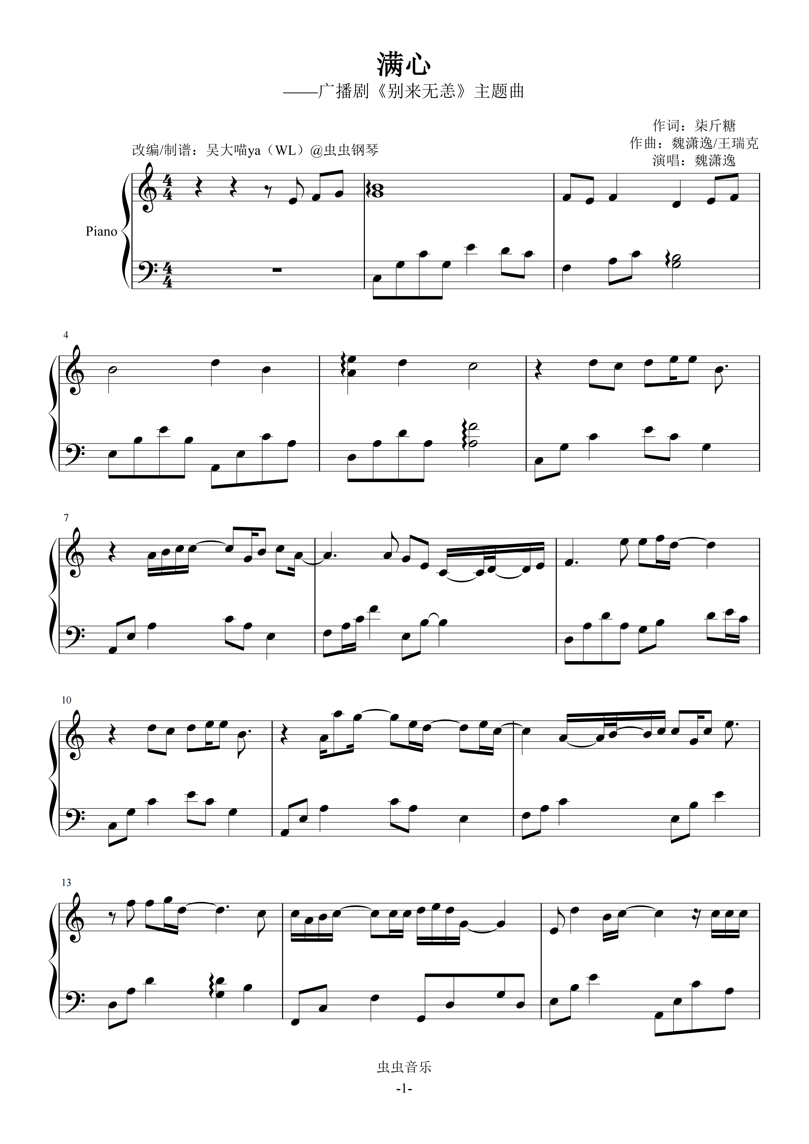 钢琴谱:满心C调-广播剧《别来无恙》主题曲