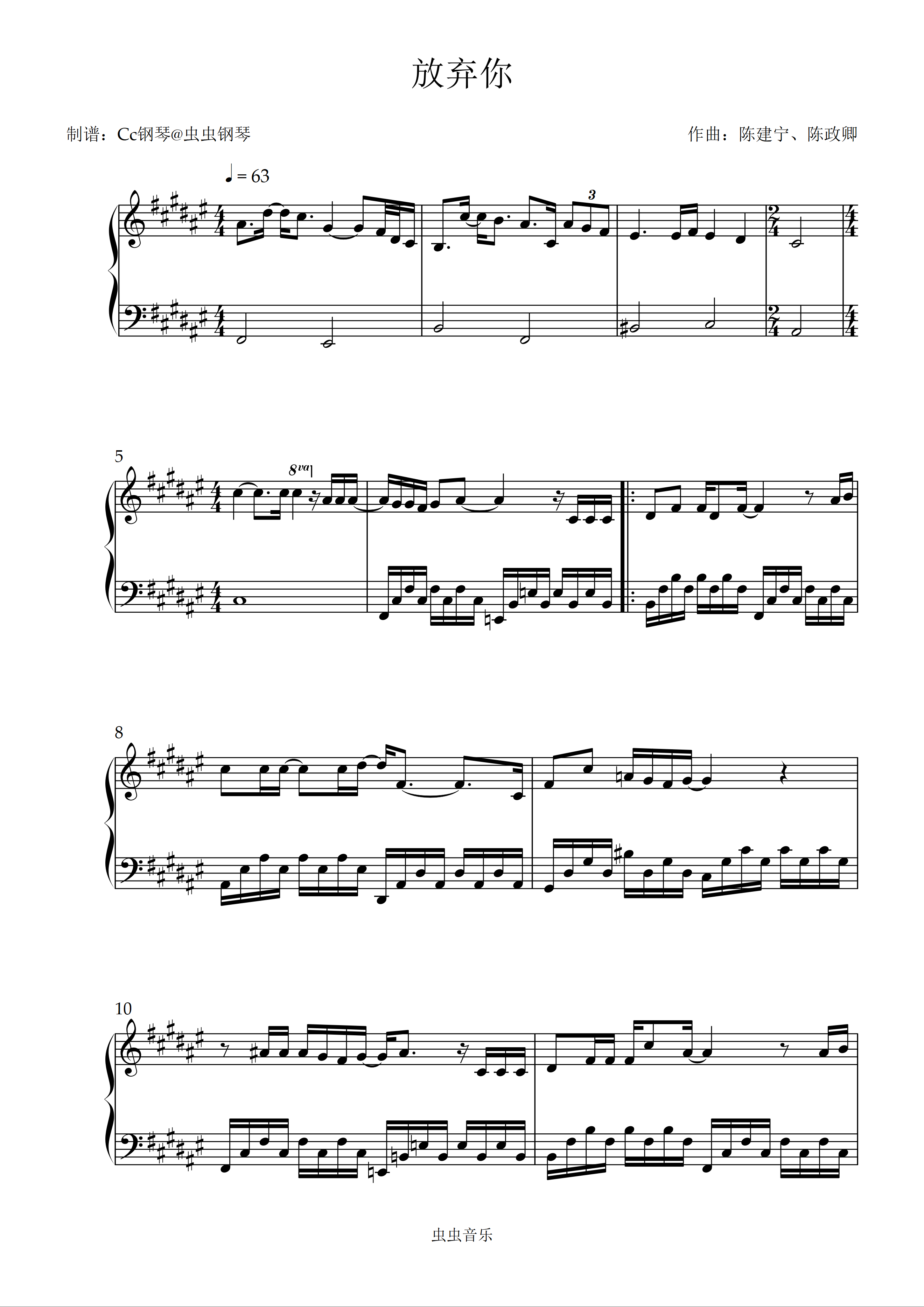 钢琴谱:放弃你 原调 好听易上手